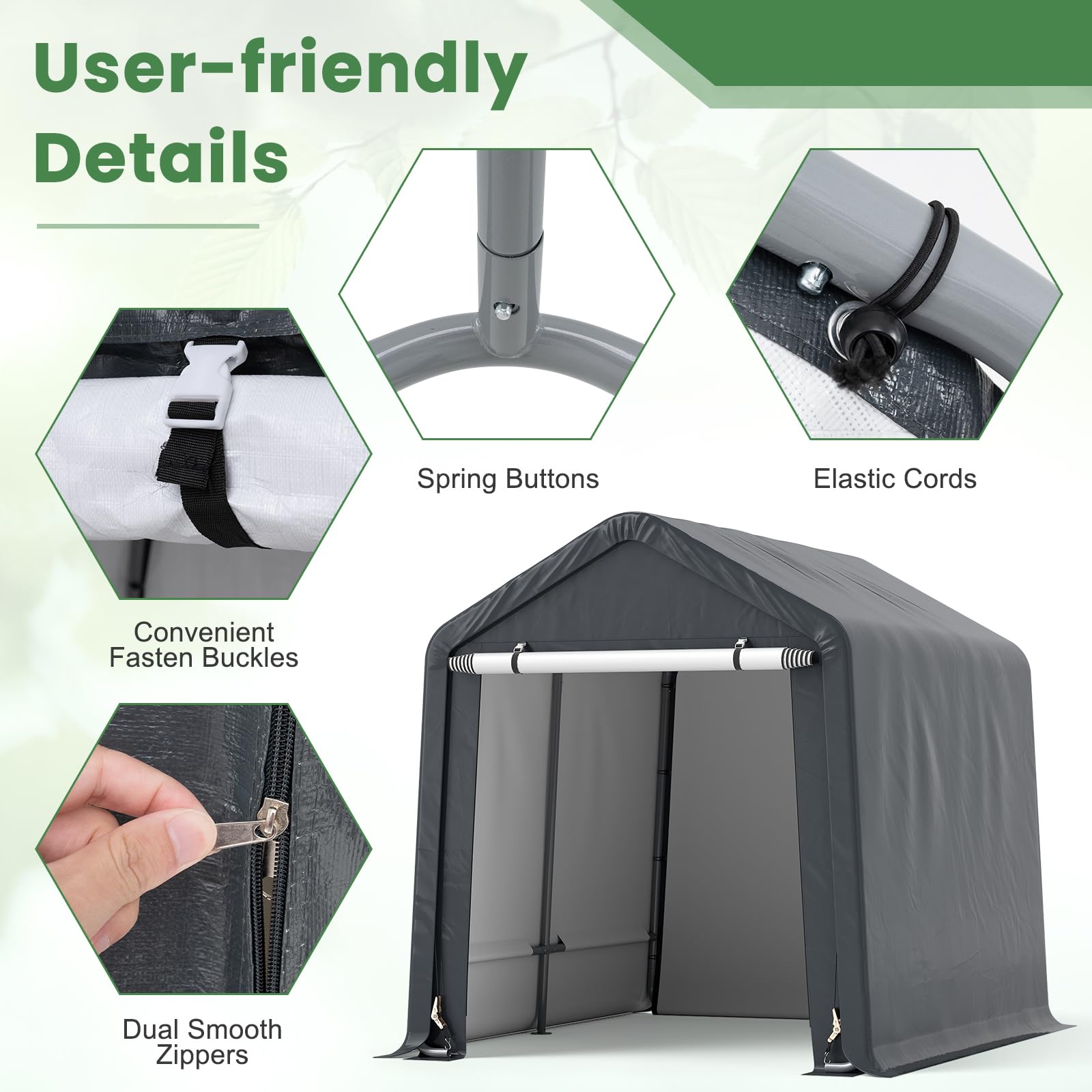 Measuring 6.5 ft x 6 ft x 7 ft/6.5 ft x 8 ft x 7 ft (L x W x H), this versatile storage shed can serve as a bicycle shed, firewood room, tool shed, or patio furniture shed as you need. The support frame of the outdoor storage shelter is built with heavy-duty galvanized steel pipes, which are resistant to rust for longevity. Additionally, the extended cover can be used to put weighted items to stabilize the storage tent. In addition, 4 ground nails and pre-drilled metal plates keep the large tool shed stand upright. Crafted from 180G PE, the canopy cover is wind-resistant, waterproof and sun-proof, ensuring your belongings to stay safe and dry. Equipped with a roll-up door, the storage shed offers easy access for you to move the tools. Moreover, ratchet mechanism will help tighten the cover.