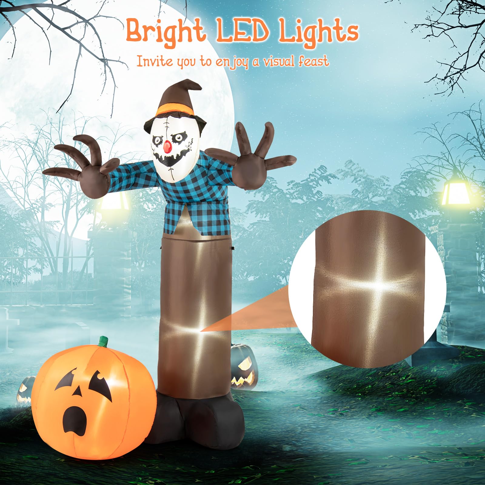- Captivating LED Lights: The inflatable haunted scarecrow features built-in LED lights that create a spooky Halloween ambiance, inviting you to enjoy a visually stunning display with your guests, day or night.