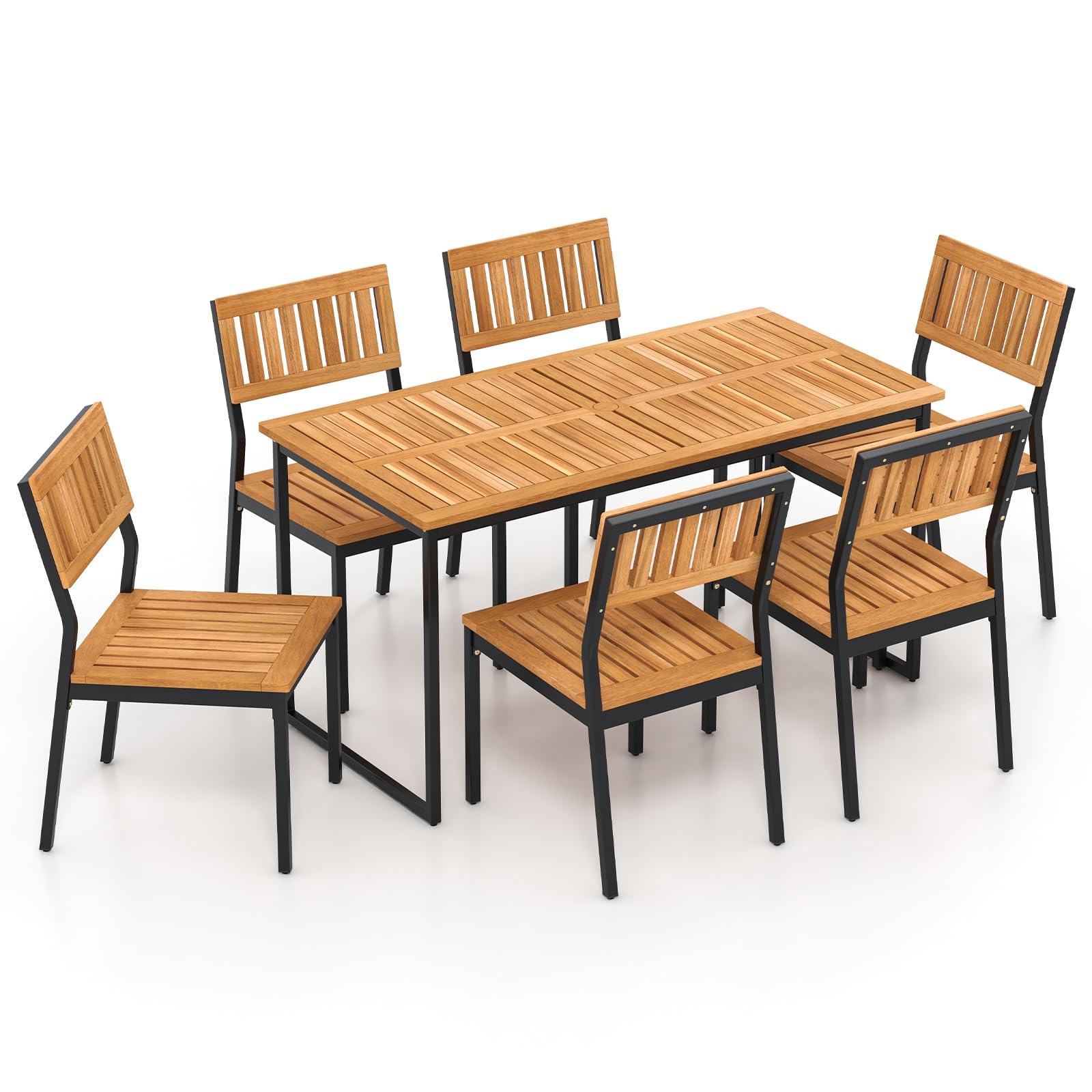 - Indoor and Outdoor Application: The fusion of acacia wood and metal accents gives these chairs a modern and rustic appeal. Whether hosting a festive outdoor BBQ or a cozy indoor dinner, this 7-piece dining table set could seamlessly fit into your patio, garden, porch, or dining room. Note: When it rains, please cover the dining set to prolong its service life.