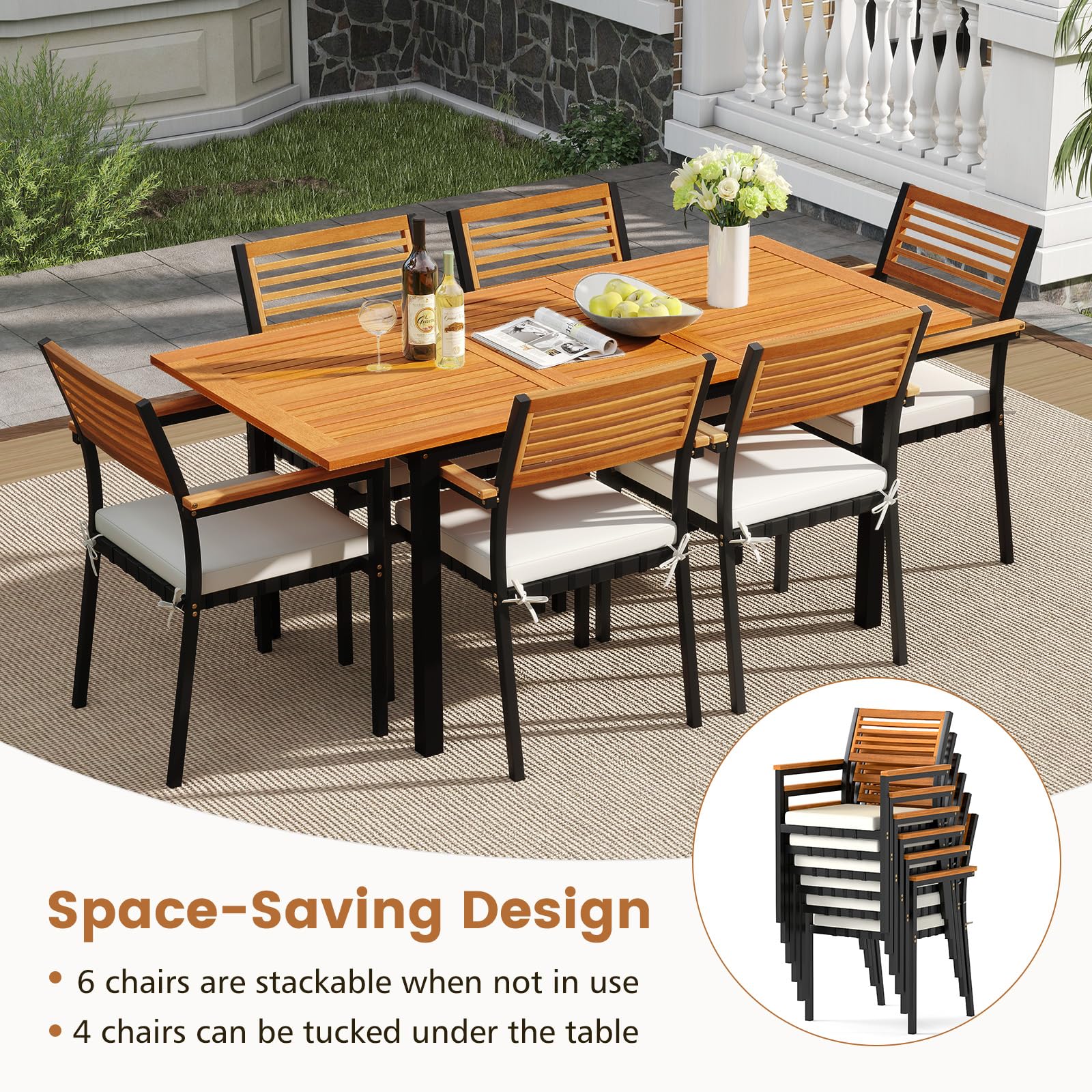 The 7-piece dining set includes an expandable table and 6 armchairs, all meticulously crafted from reliable acacia wood and sturdy metal. This set not only offers a robust build for long-lasting use but also adds a touch of elegance to your patio or garden. The rectangular easily extends from 51” to 64” to accommodate additional guests, perfect for various gatherings, from family dinners to larger social events. The chairs are designed to stack for space saving. Each chair is equipped with thick padded cushions with removable zippered covers for easy cleaning, maintaining both comfort and hygiene. The table itself boasts a functional slatted wood top, complete with an umbrella hole to fit a standard patio umbrella for those sunny days.