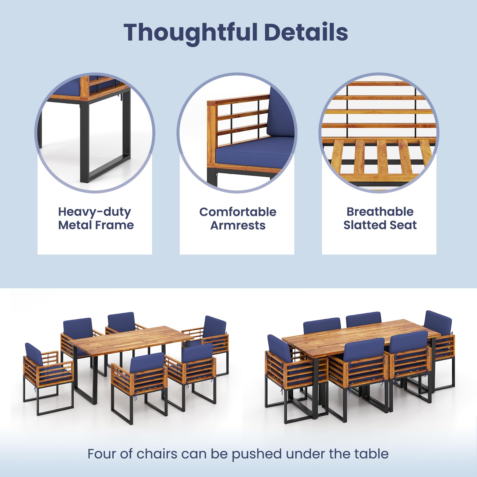 Transform your backyard into an elegant relaxing area with this 7-piece patio dining set. Crafted with premium quality acacia wood and heavy-duty metal, this dining set features long-lasting service life. The spacious tabletop with an umbrella hole provides ample space for your family and guests to enjoy outdoor dining. And the dining chairs with seat and back cushions allow you to sit with softness, making it perfect for long hours of outdoor dining. The elegant design of the dining set adds a touch of sophistication to your outdoor space. Whether you want to enjoy an intimate dinner with your partner or entertain your family and guests, the 7-piece patio dining set is the perfect addition to your outdoor setup.