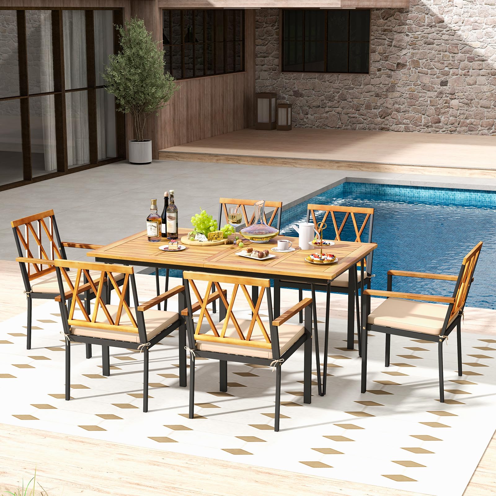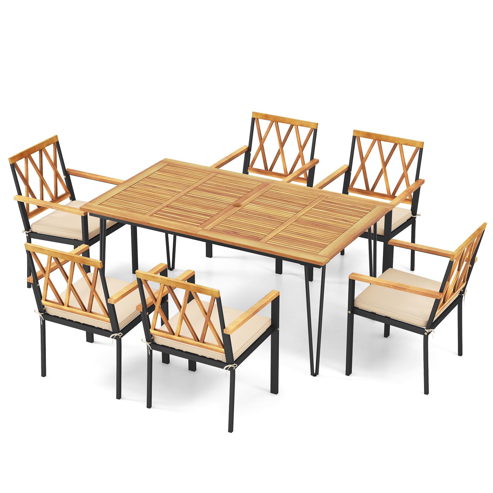 Enhance your outdoor living space with our 7 piece patio dining set including a spacious rectangular dining table and 6 chairs. Crafted from selected acacia wood and a sturdy metal frame, this dining set not only add natural beauty to your outdoor space, but also ensures exceptional durability. Soft seat cushions also provide a comfortable seating experience. Additionally, the dining table features a reserved 2” umbrella hole allowing for added shade on sunny days. Our acacia wood patio furniture set combines style and functionality, making it perfect for patio, garden, poolside, or backyard use. Upgrade your outdoor space today with this premium outdoor dining set!