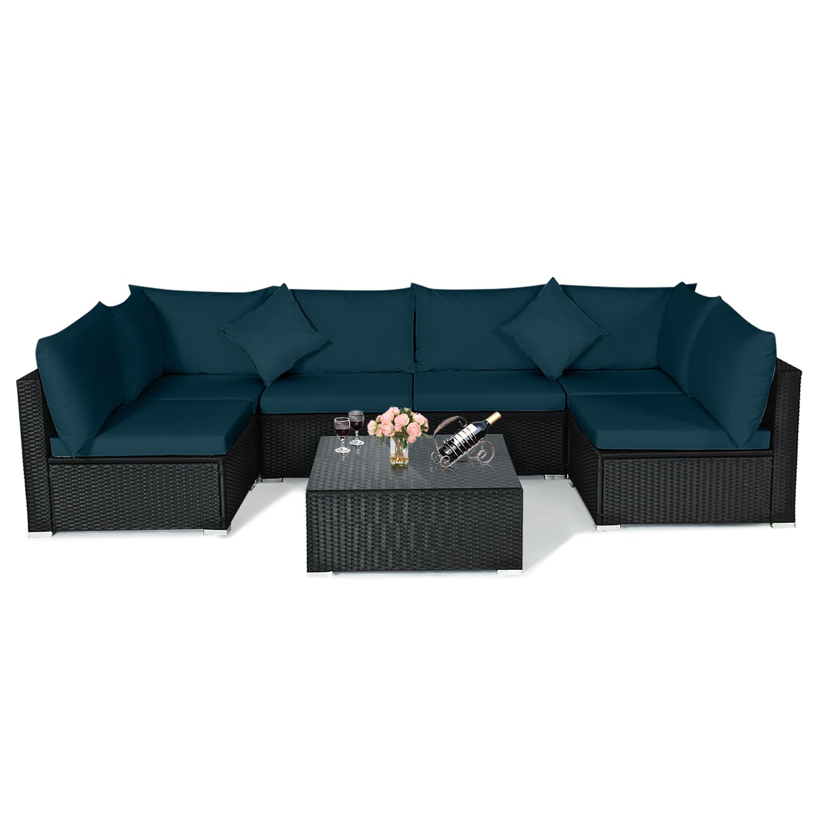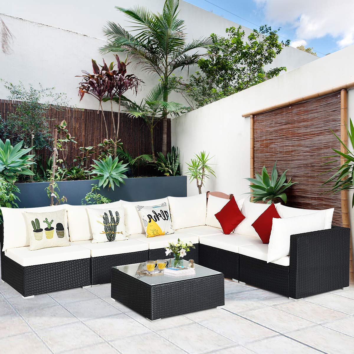 Our premium 7-piece patio furniture set comes with 4 armless sofas, 2 corner sofas, and a coffee table, so you can flexible combination based on your needs and room space. Made of superior steel and sun-resistant PE rattan, the patio furniture set has a long lifetime as well as a large weight capacity. Besides, thick seat cushions, back cushions, and pillows for extra cozy. Besides, all cushions have off-white and black cushion covers, which are removable and washable for their zipper design. The coffee table with tempered glass top is durable and functional. It is a great addition to your patio, garden, backyard, pool, and other space.