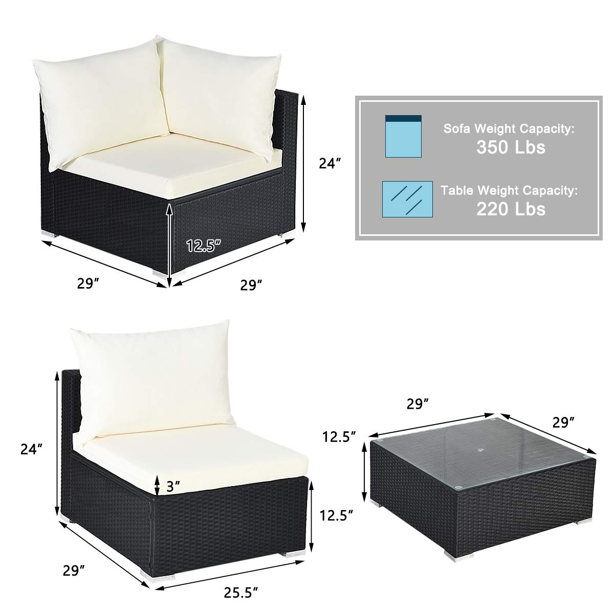 - Easy Assembly and Simple Maintenance: Comes with clear instructions and numbered parts, this patio sofa set is easy to put together. Please do not tighten all the screws until all the holes are aligned. Thanks to the PE rattan frame, this patio sofa set is easy to clean and maintain. Please avoid rain exposure for prolonged service life. Armless sofa dimension is 25.5"x29"x24"(LxWxH). Corner sofa dimension is 29"x29"x24"(LxWxH). Coffee table dimension is 29"x29"x12.5"(LxWxH)
