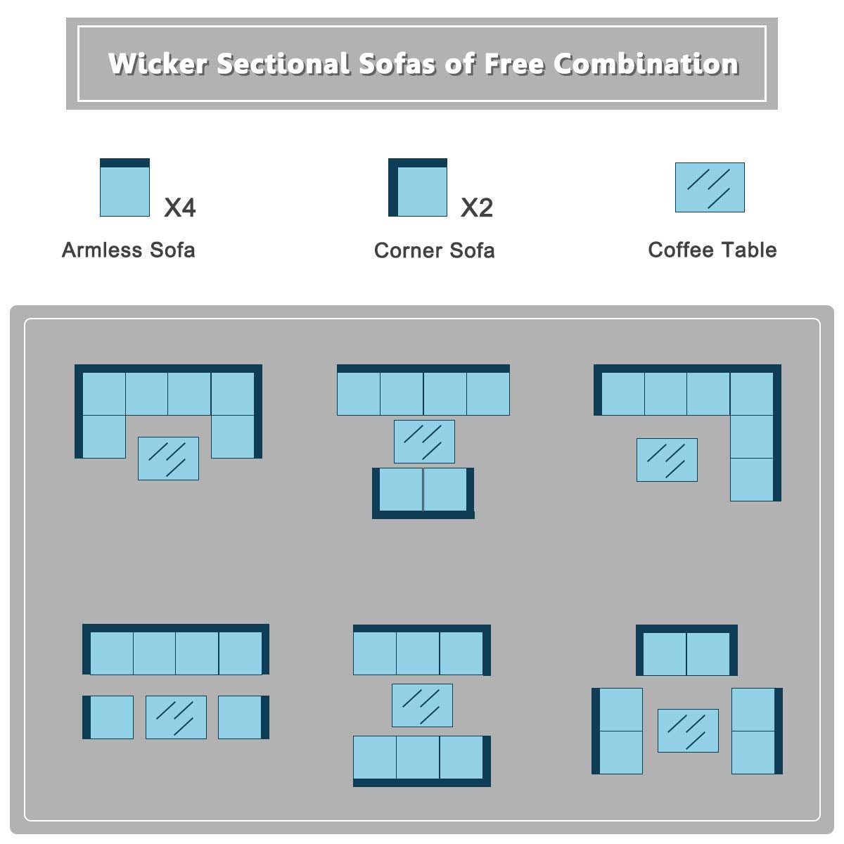 - Free Combination of Sectional Sofa: Comes with four armless sofas, two corner sofas, and a coffee table, this patio furniture can flexible in combination according to your needs and based on your room space. In addition, 10 clips secure the sofa firmly together to avoid sliding. The patio furniture set with ample seats allows you to relax with your friends.