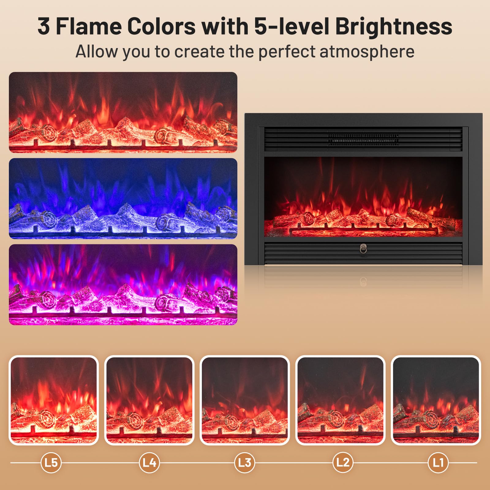 This faux fireplace offers a stunning array of 3 flame colors and 5 brightness levels, operable with or without heat to enjoy year-round. Equipped with 750W/1500W settings, the fireplace heater efficiently heats spaces up to 400 sq.ft, backed by a thermostat adjustable from 62℉ to 82℉. Certified with ETL and featuring overheat protection, it promises security. Enhance convenience with the remote control, allowing adjustments over flame settings, heat levels, temperature and an 8-hour timer from a distance of up to 20 ft.