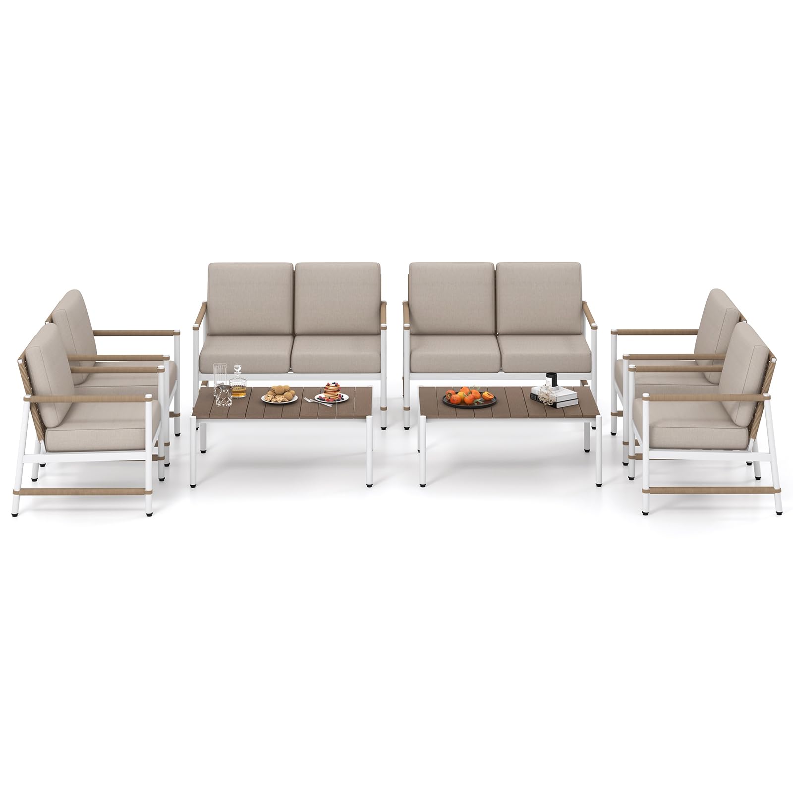 The set includes 2 comfy single sofas, a cozy loveseat, and a chic table, all built to last with sturdy aluminum frames, non-slip foot pads, and fancy woven PE rattan details. The plush, 5” thick cushions and ergonomic backrests on the loveseat and chairs offers a comfy embrace while you chat. Also included is a coffee table, featuring an easy-to-clean top perfect for setting down your drinks. Plus, the cushion covers are removable for simplified upkeep. Our outdoor conversation set is the ideal match for any patio, deck, yard, or poolside, blending function with a modern flair that's sure to make your outdoor space the place to be!