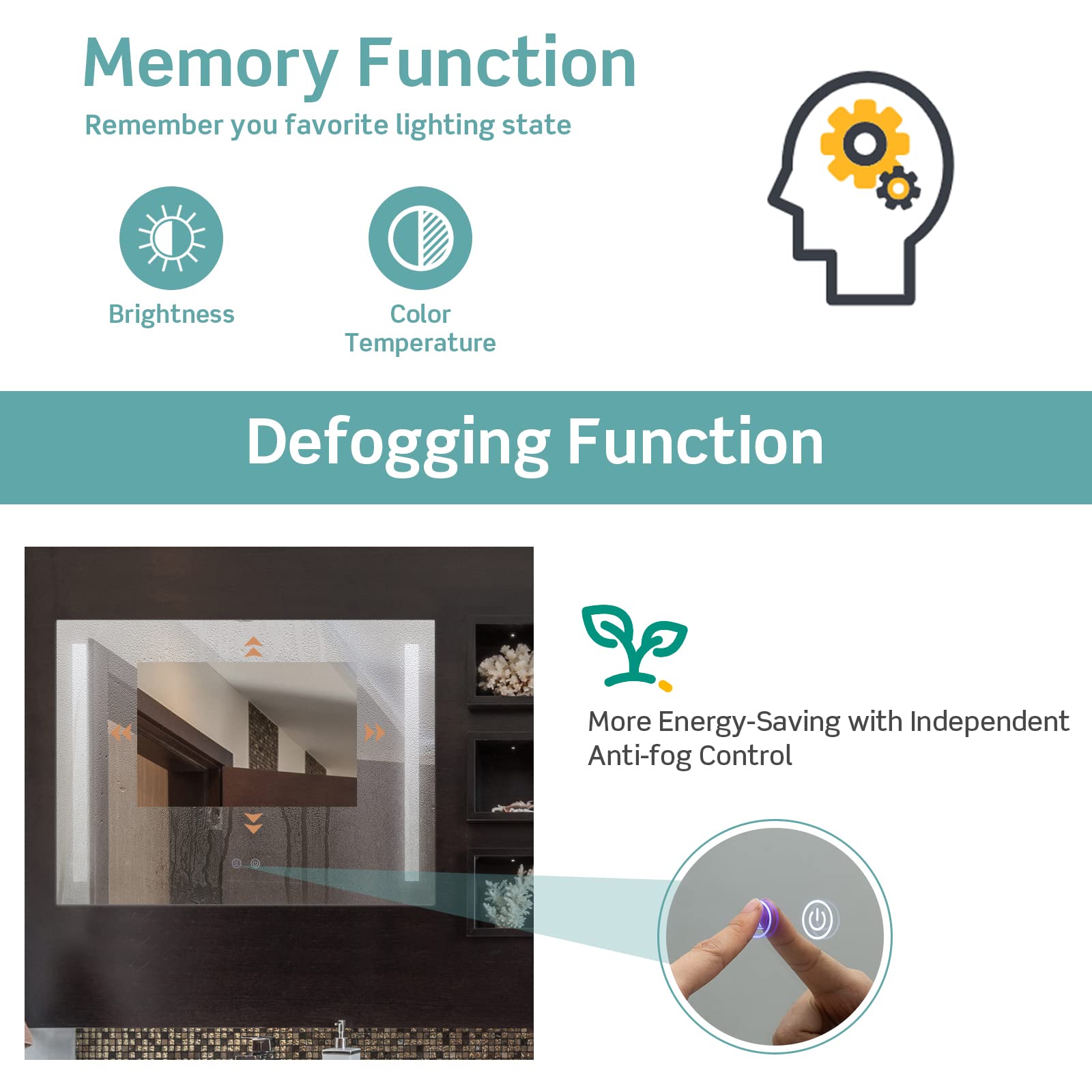 Light up your beauty with our LED bathroom mirror. 3 color temperatures and 20%-100% infinitely adjustable brightness will meet your different lighting demands. The adjustment is easy to make by pressing the touch button. Besides, this lighted mirror with memory function can keep the previous lighting state when you turn it on, saving your time and effort. Equipped with anti-fog function, you don’t need wipe the mirror after showering. There are 2 power supply ways for you to choose: plug in or connect to the wall switch. Coming with detailed instructions and required accessories, the installation is easy.