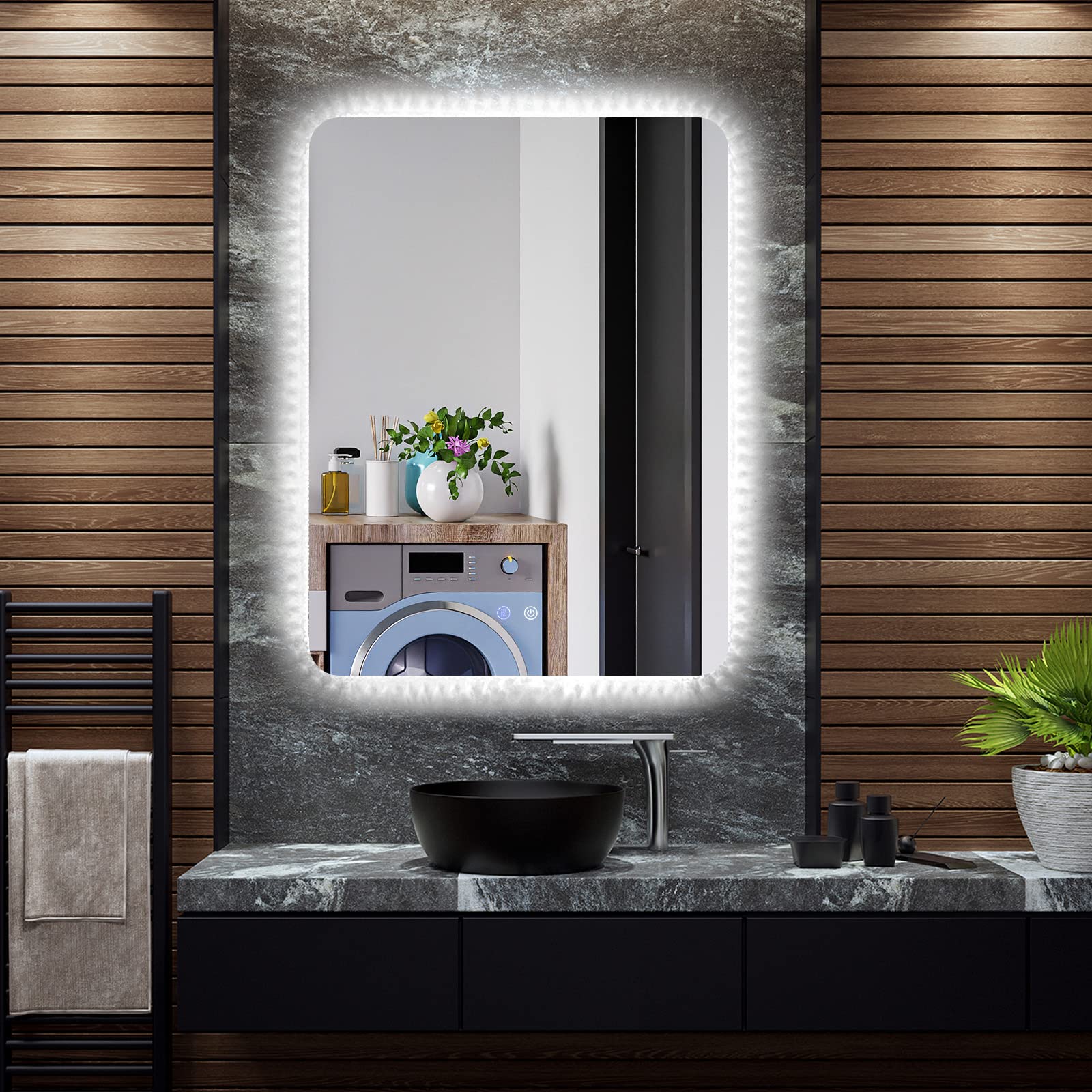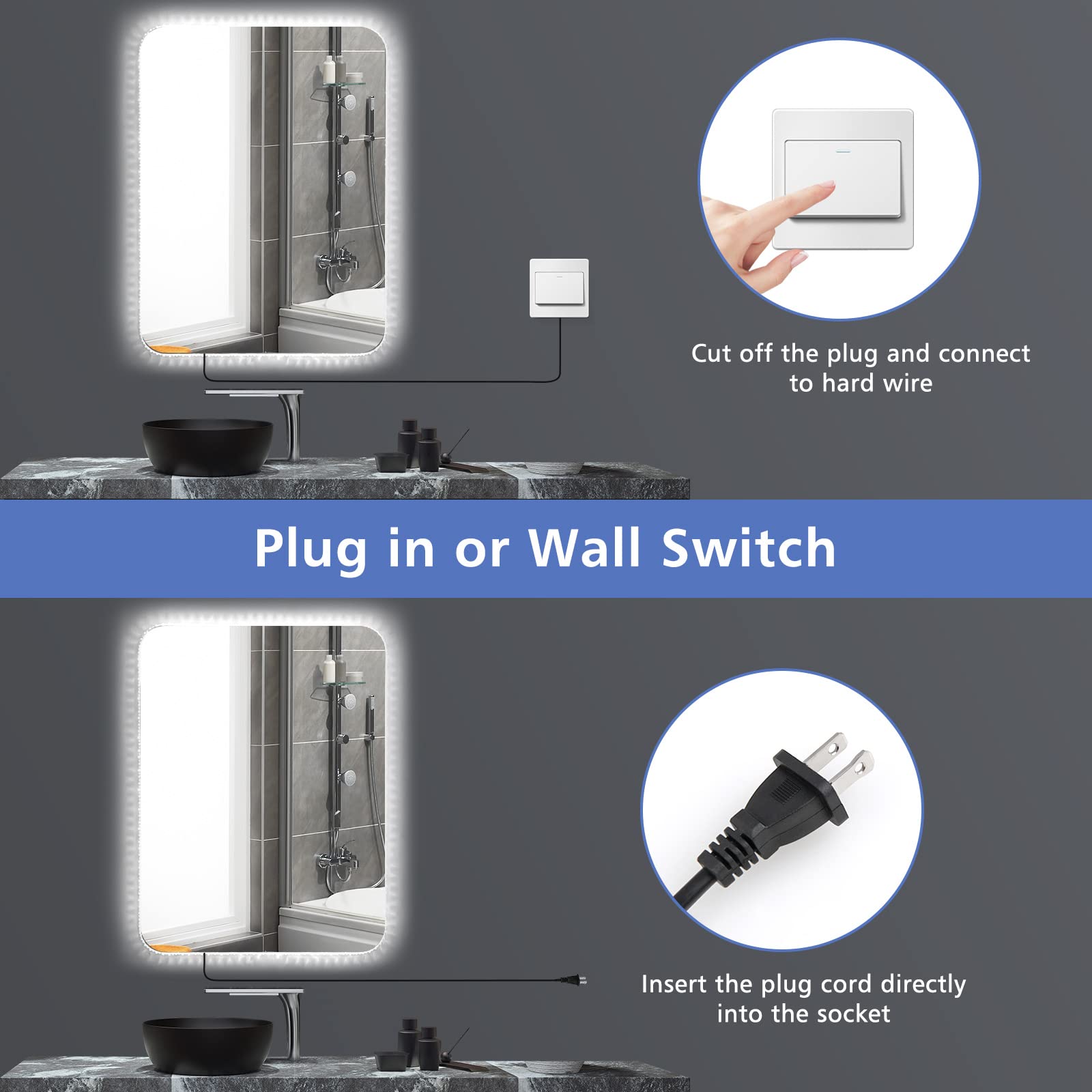 Featuring crystalline frame, our LED bathroom mirror creates a dreamy atmosphere to your space. The 3 color temperatures and 20%-100% adjustable brightness will meet all your daily needs. You only need to press the touch button to make adjustment. Built in memory and defogging function, you will enjoy maximum convenience during use. Our high definition mirror is made of copper-free glass that is durable. Also, the explosion-proof film can prevent broken glass from splashing if the mirror is accidentally hit. This lighted mirror supports vertical and horizontal mounting, and the mounting accessories are included in the package. You can use the plug or connect the wire to the wall switch.