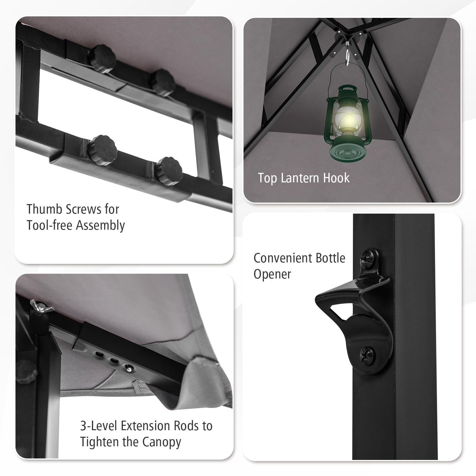 - Large Double-tiered Canopy: The 8 x 5 ft grill gazebo provides ample sunshade for delightful BBQ sessions or parties with your loved ones. More than that, the double-tiered canopy top will reduces heat accumulation, creating an enjoyable environment for you.