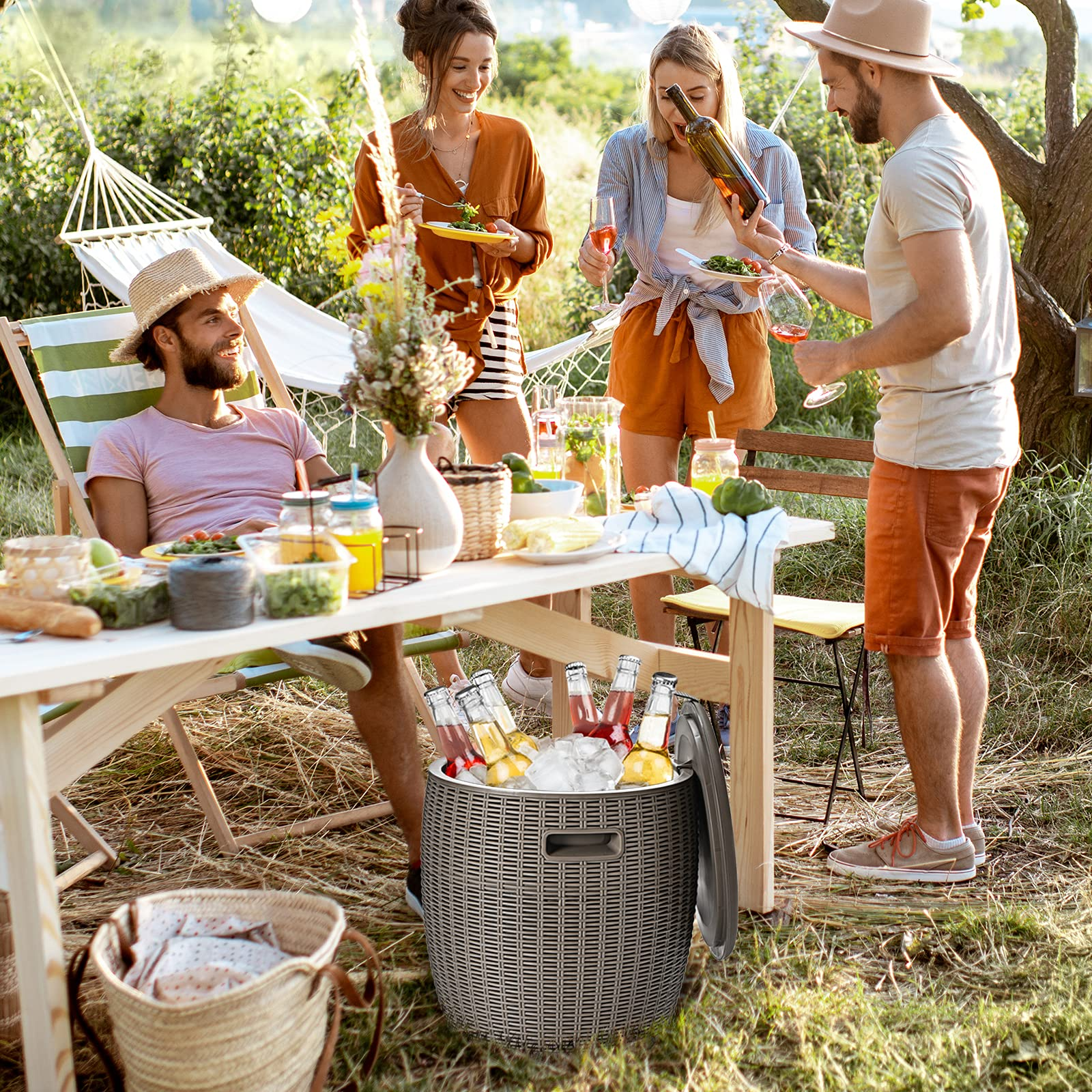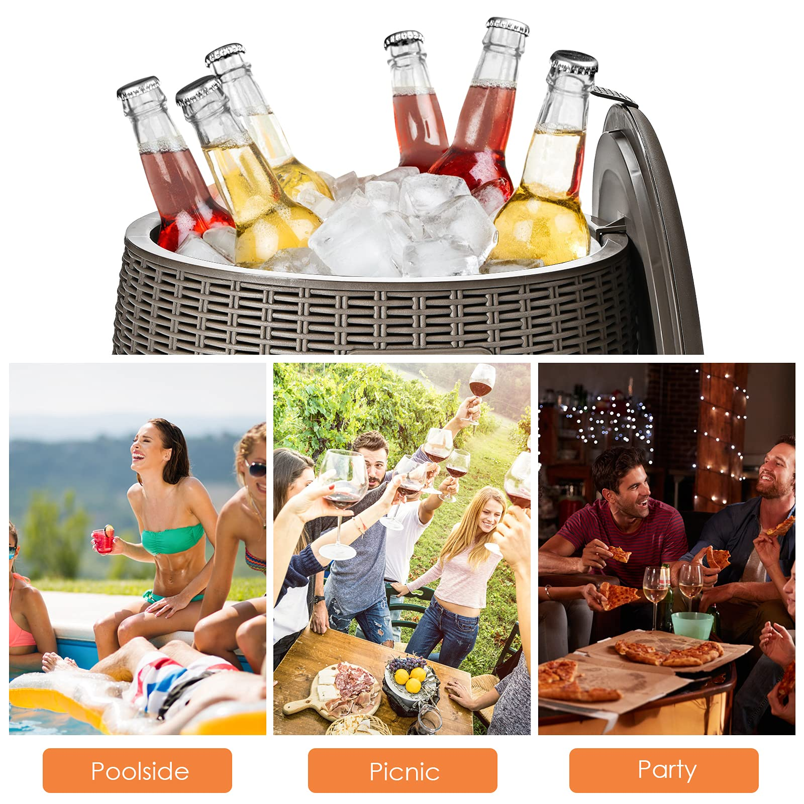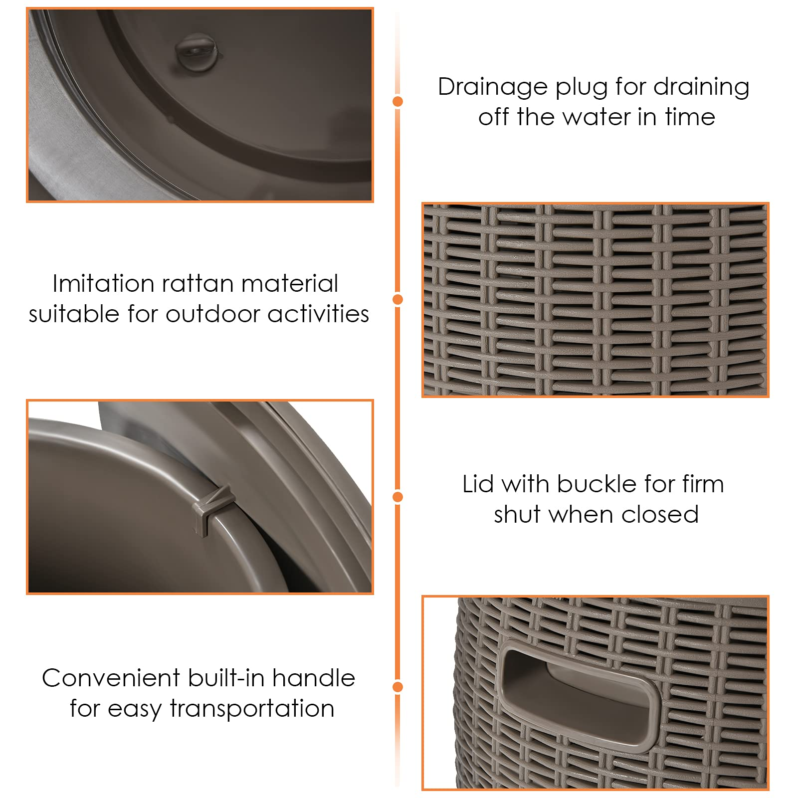 Are you looking for a practical ice cooler that meets other needs for your parties? Then you've come to the right place! Our multifunctional 4-in-1 ice cooler offers you the opportunity to enjoy the advantages of 4 for the price of just one product! With a capacity of 35 L(9.5 gals), it is able to keep drinks and snacks cool for guests for hours. Put the lid on and you have a side table for drinks or a stool with storage space! The smooth inside is easy to clean, and it has a drain plug for draining off the molten liquid. With its rattan look, it is also an absolute eye-catcher.
