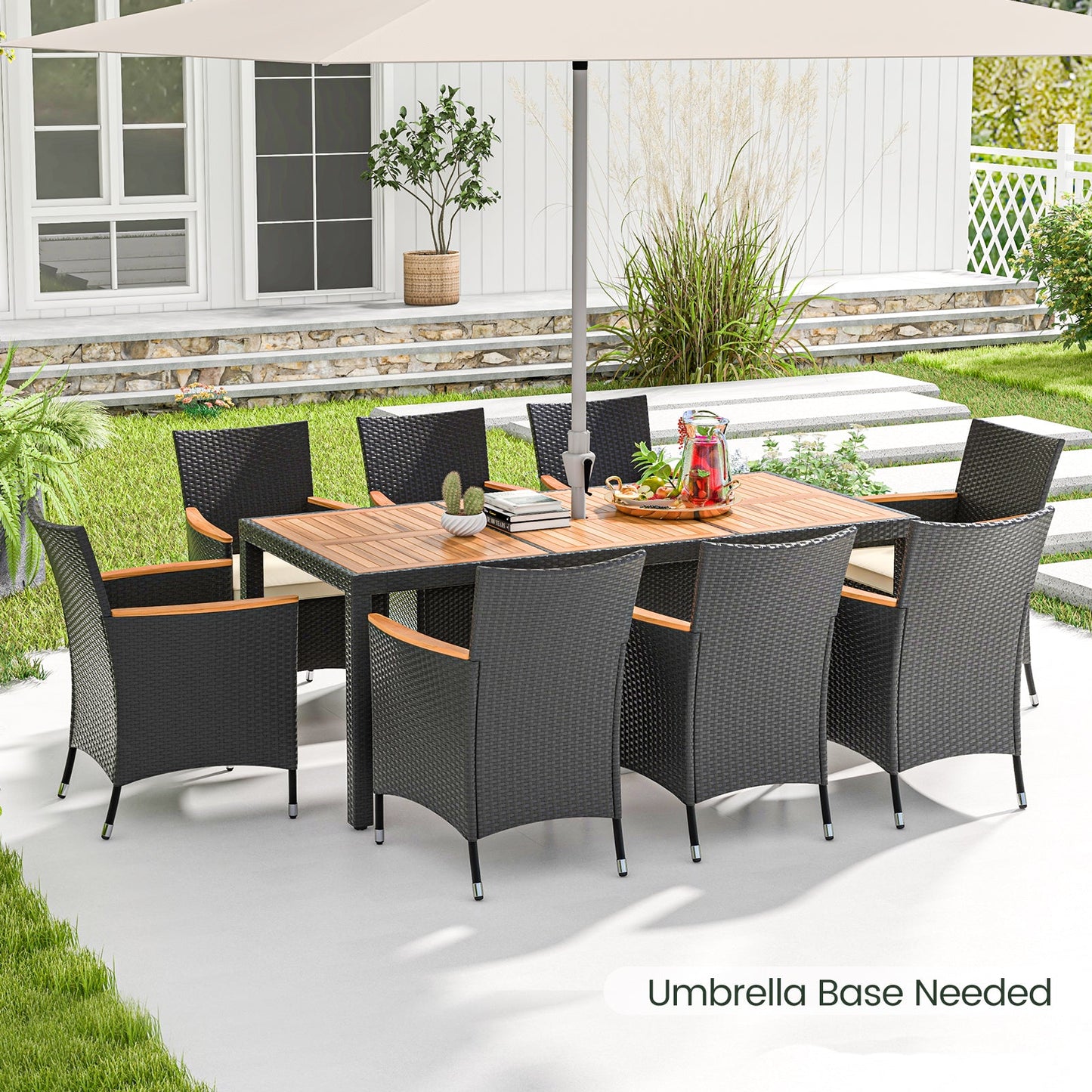 Transform your outdoor space with our exquisite patio dining set. Crafted from the acacia wood, the practical outdoor table shows timeless charm while ensuring durability. Embrace relaxation with the 1.97" umbrella hole, providing a shaded retreat under your parasol. Indulge in the utmost comfort with the 8 luxurious rattan chairs, designed with inclined backrests and armrests for ergonomic support. Made of superior materials, the seat cushions offer a perfect balance of durability and coziness, featuring waterproof and tear-proof non-woven fabric and thick sponge. With removable and zippered covers, they are a breeze to clean. The stable metal structure, equipped with adjustable foot pads and anti-slip foot pads, ensures exceptional stability and a substantial load capacity. The premium PE rattan, resistant to fading, adds an elegant touch to any deck, garden, poolside, or backyard.