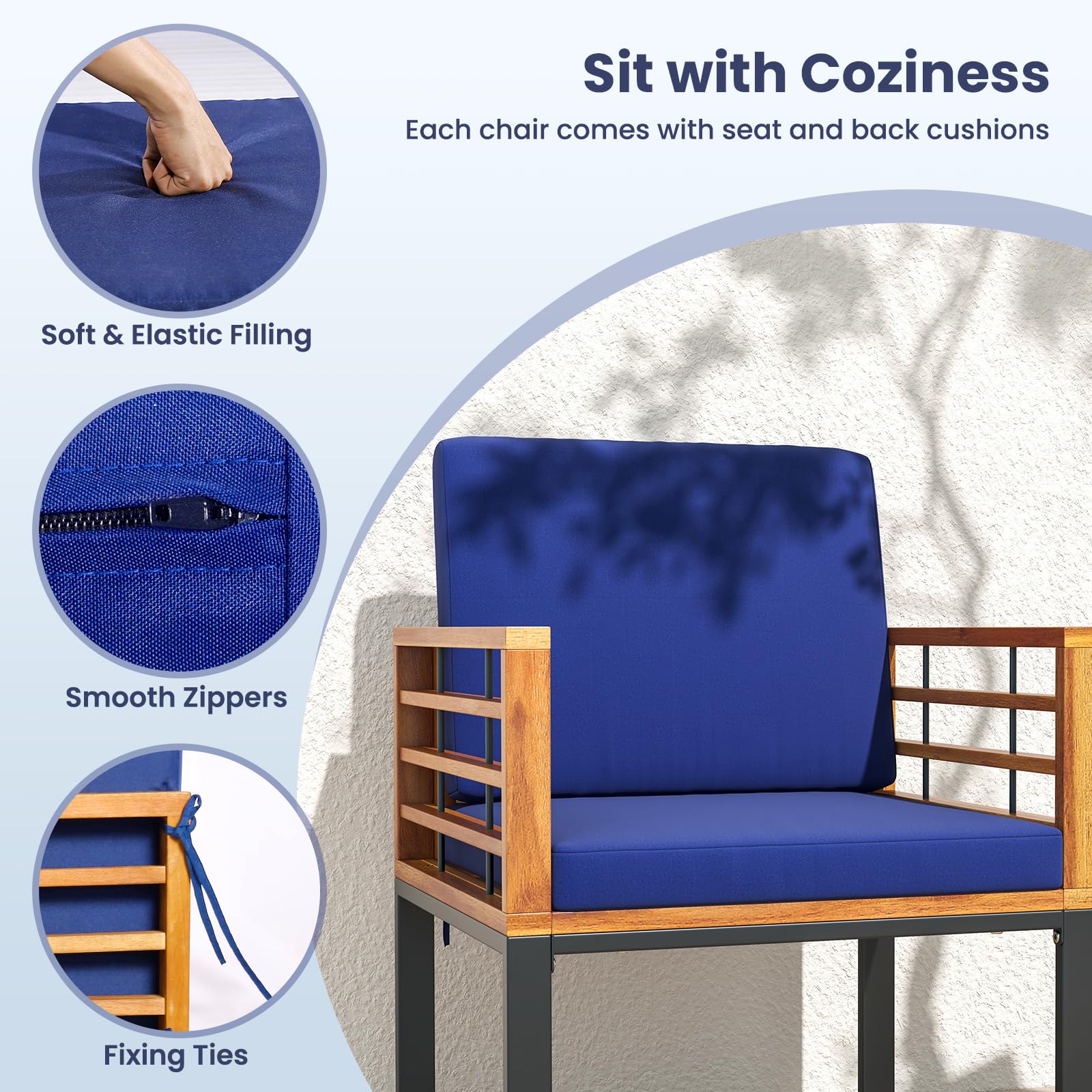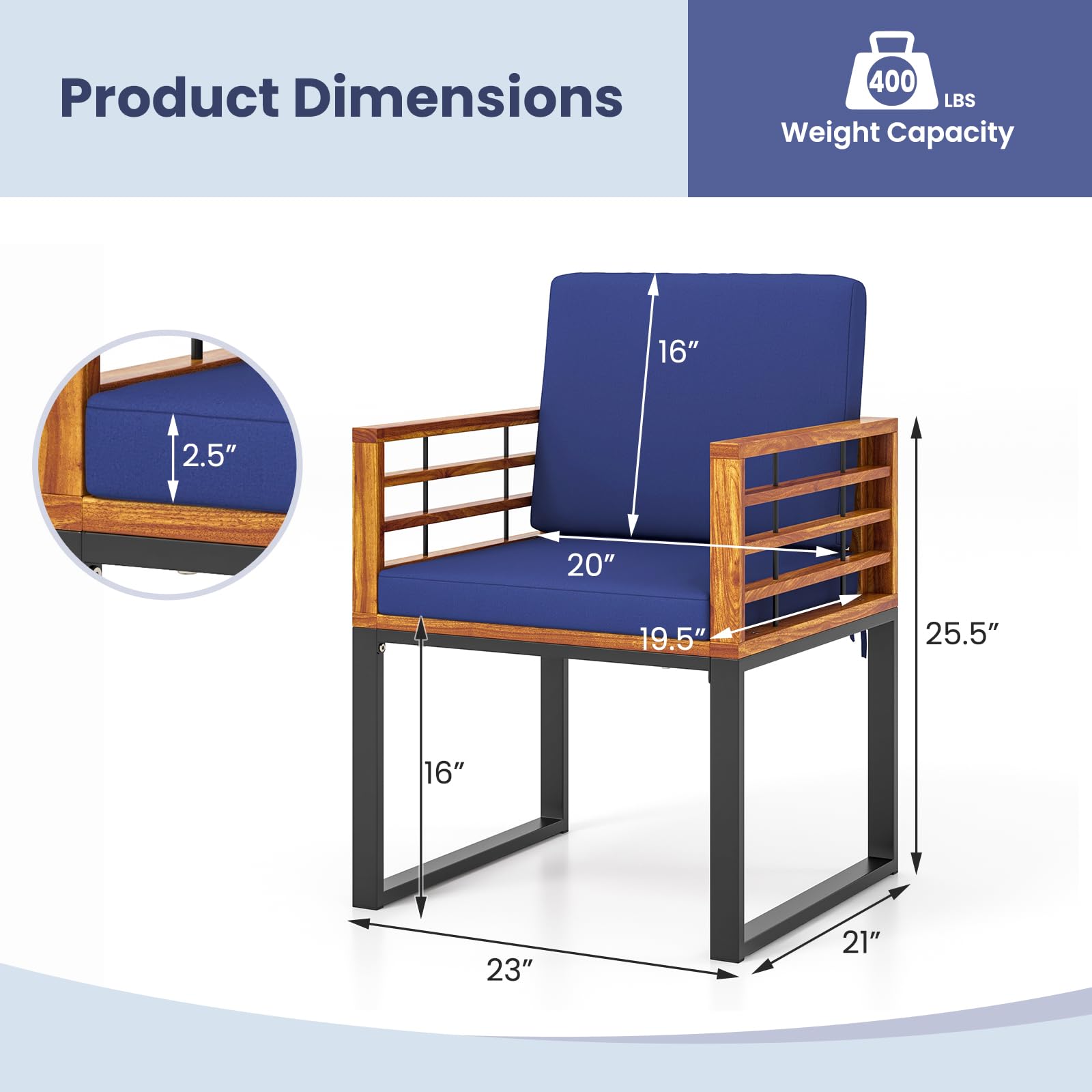 These patio armchairs feature a sturdy metal frame that supports up to 400 lbs, ensuring reliable stability. The robust construction is beautifully complemented by splinter-free acacia wood, known for its natural beauty and strength. Designed with your comfort in mind, each outdoor wood dining chair comes with soft cushions equipped with fixing ties for secure placement. Plus, these cushions also boast removable covers for easy cleaning. Ergonomically designed with cozy armrests and a wide seating area, these outdoor wood chairs make you feel comfortable.