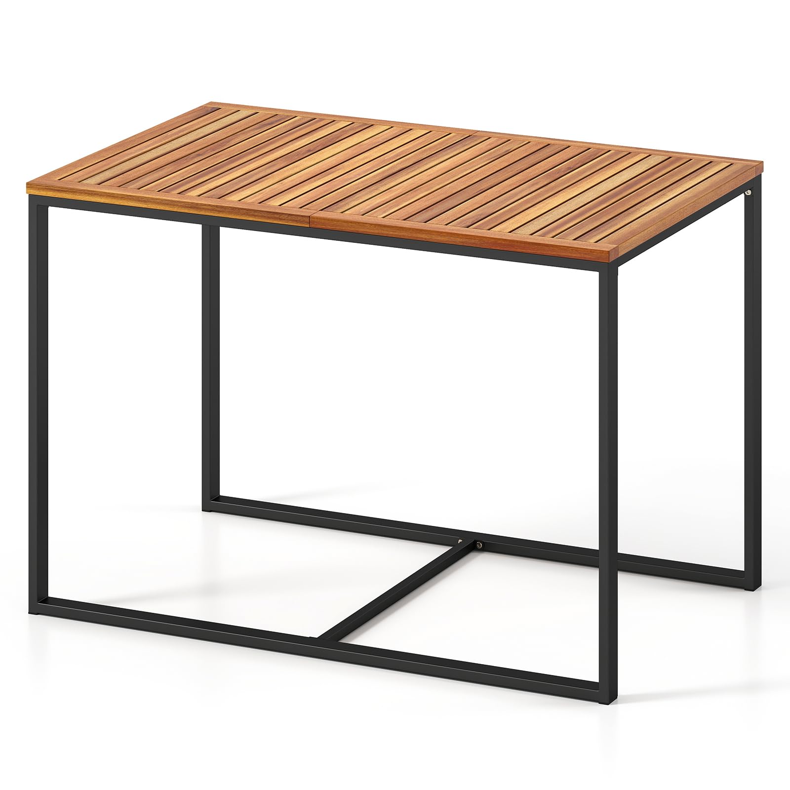 Its 43.5" x 27.5" rectangular tabletop comfortably seats 4, ideal for intimate gatherings in your garden, lawn, porch or backyard. Crafted from splinter-free acacia wood and supported by a robust metal frame with a reinforced crossbar, this outside table ensures stability and long-lasting use. The seamless blend of natural beauty with a modern touch harmoniously complements different outdoor decorations, making it a versatile addition to your home that enhances every occasion.