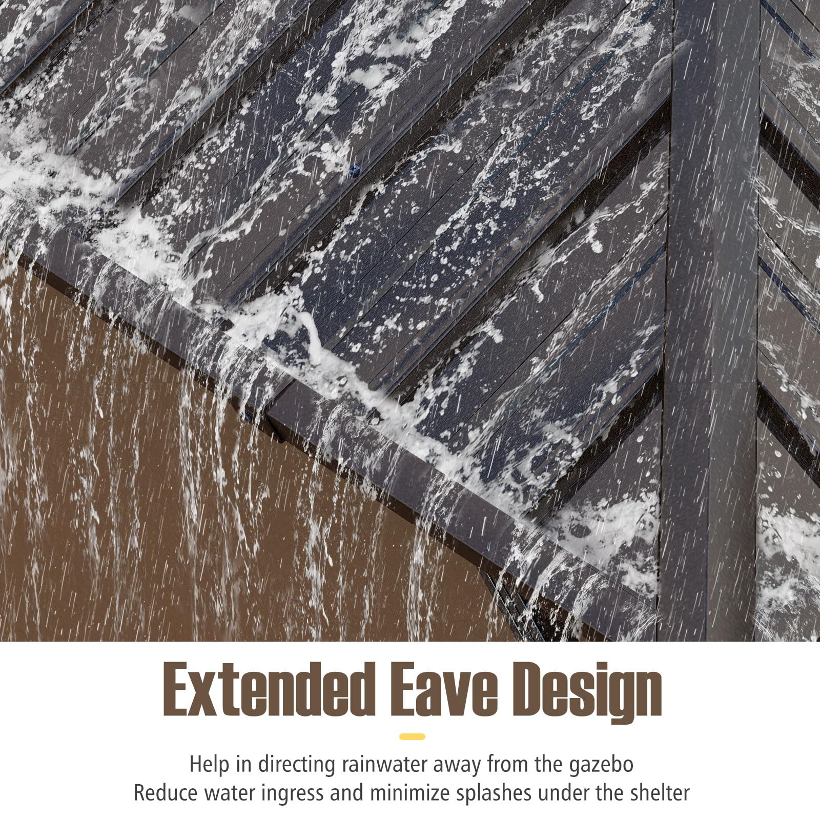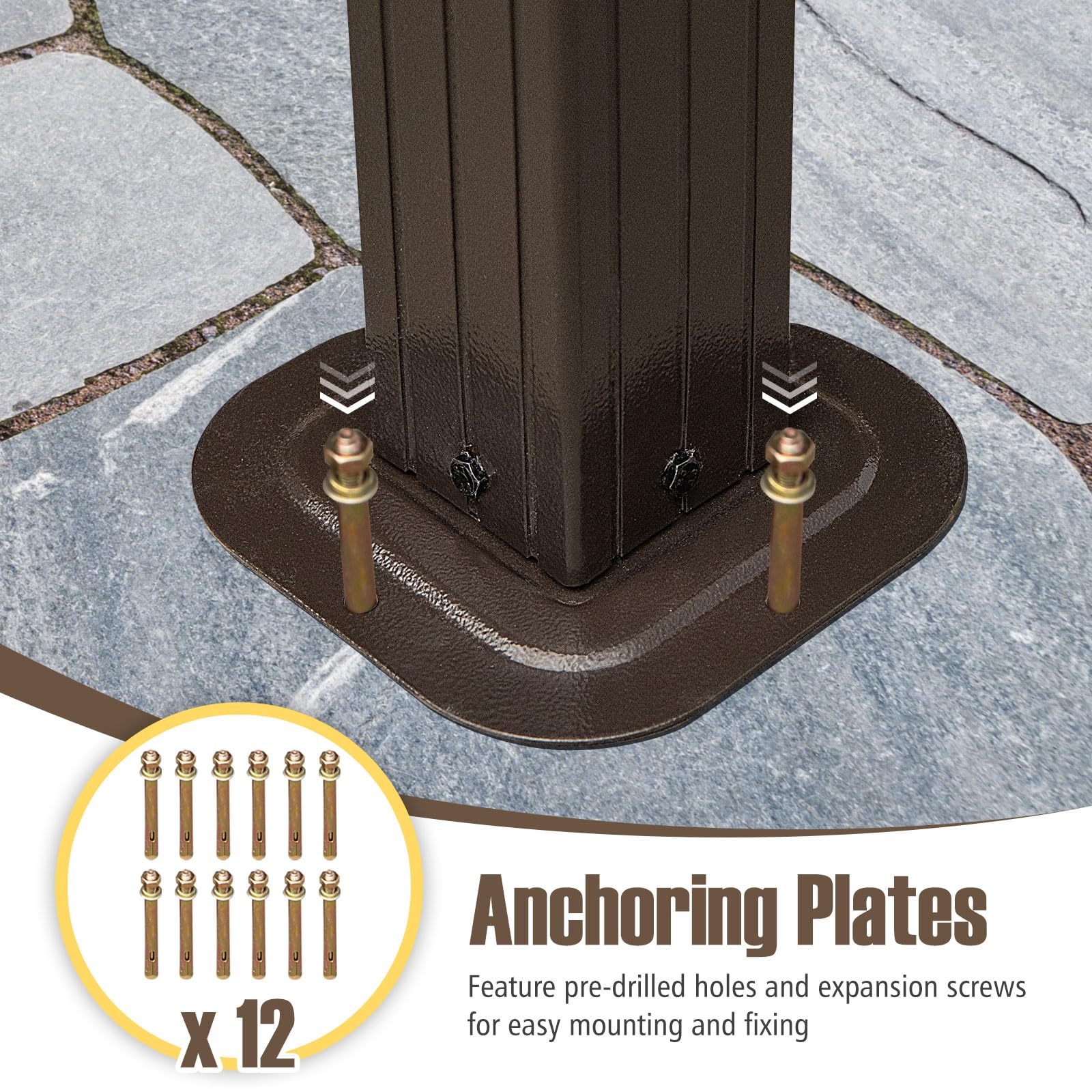 Our 10 x 10 ft/10 x 12 ft/12 x 12 ft/12 x 14 ft/12 x 16 ft hardtop gazebo comes with a double-layer galvanized metal roof, ensuring good ventilation while offering superior protection from sun, rain, wind, and snow, which is a perfect year-round heaven for outdoor gathering. The aluminum frame is engineered for durability and stability, resistant to rust and reinforced with anchoring plates, including 12 expansion screws for securing of concrete floors, ensuring it remains securely anchored in place even during rough weather. Besides, featuring integrated double-layer sidewalls, complete with mesh netting and zippered curtains, you can enjoy an intimate setting free from "unexpected guests" and prying eyes, or open up to let the breeze flow through on warmer days. The addition of a ceiling hook provides versatile options to enhance the ambiance, easily hanging a light, fan, or flower basket to customize your setup for any event. From leisurely afternoon tea to lively evening parties, this gazebo is spacious enough to host a variety of activities!