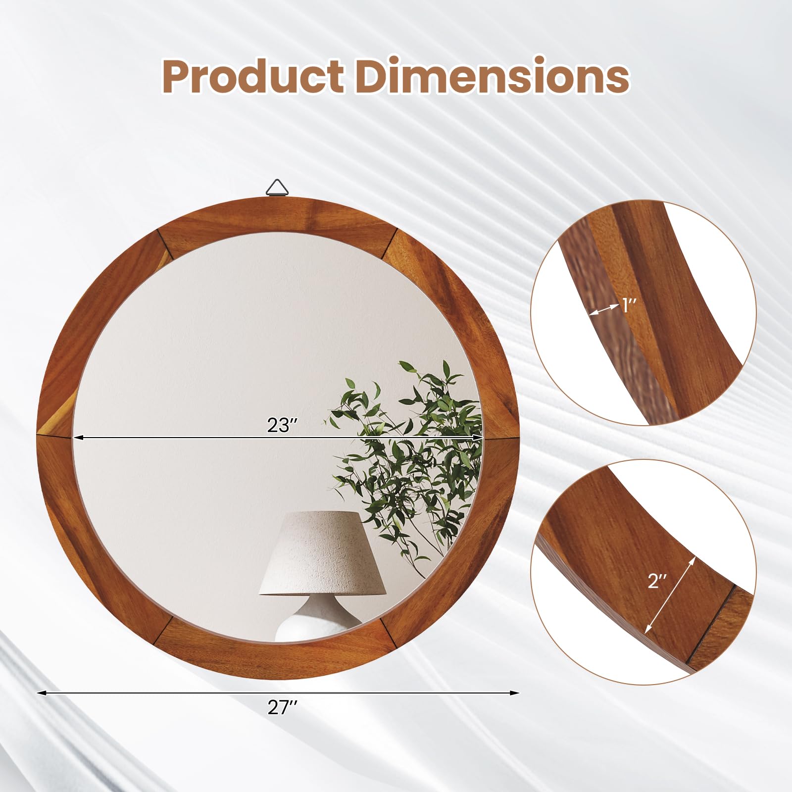 Built with a solid and natural acacia wood frame, this wall mirror is ideal for adding a touch of rustic elegance to any room. This versatile mirror is not just a decorative piece but a practical addition to your home. Whether mounted in your entryway, living room or bedroom, it brings light and depth into your space. The sturdy metal hook allows for easy hanging. Moreover, the mirror is made of shatterproof glass to minimize risk and ensure durability. An added layer of explosion-proof film on the back of the mirror acts as a protective barrier, enhancing safety.