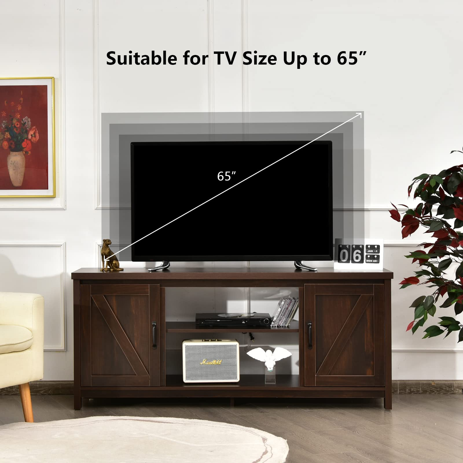 Whether placed in your living room or bedroom, this TV cabinet is a great addition that provides ample space for displaying and storing your items. This 59" wide TV console can hold flat screens up to 65" Featuring 4 cable management holes on the backboard, the TV console brings a convenient way to keep your cable clutter-free. Besides, the storage cabinet with adjustable shelves allows you to store a variety of items at different heights. Made of thickened engineered wood, our TV stand is not only beautiful in appearance but also has good durability and stability. This multifunctional TV cabinet is ideal for your living room, bedroom, dining room, and more. Don't miss it!