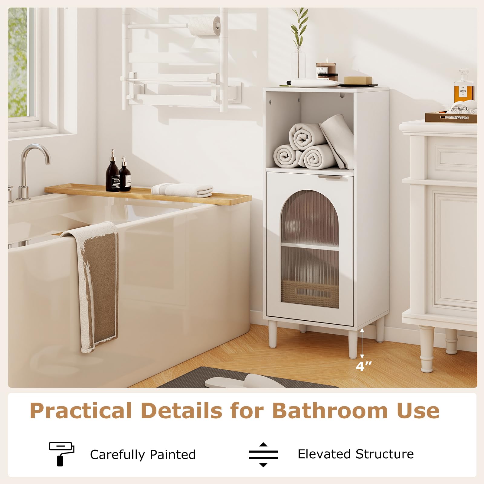 With a wide countertop, open compartment, and spacious enclosed cabinet, this storage cabinet provides multiple bathroom storage options. Its adjustable 3-position shelf system allows for custom storage needs. It will be easier for you to neatly organize your skincare products, body wash, shampoo, towels, toilet paper, hair dryer, and more. The sturdy, enduring storage organizer supports up to 176 lbs and comes with an anti-tipping kit and solid wood legs for stability. Moreover, the tempered glass door is delicate and easy to maintain. Carefully painted and standing 4” off the ground, it is a perfect fit for bathrooms.