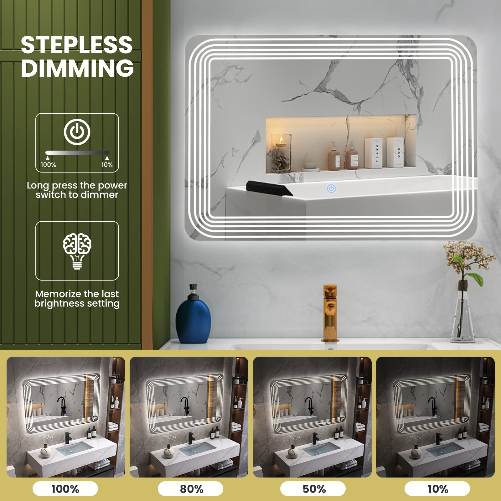 - Dimmable & 3-Color Settings: Our LED bathroom mirror comes up with 3 light temperatures---3000K warm light, 4500K neutral light, and 6500K cold white. Long press the touch switch to adjust the light intensities from 10% to 100%. And the memory function will remember the status of your last lighting settings.