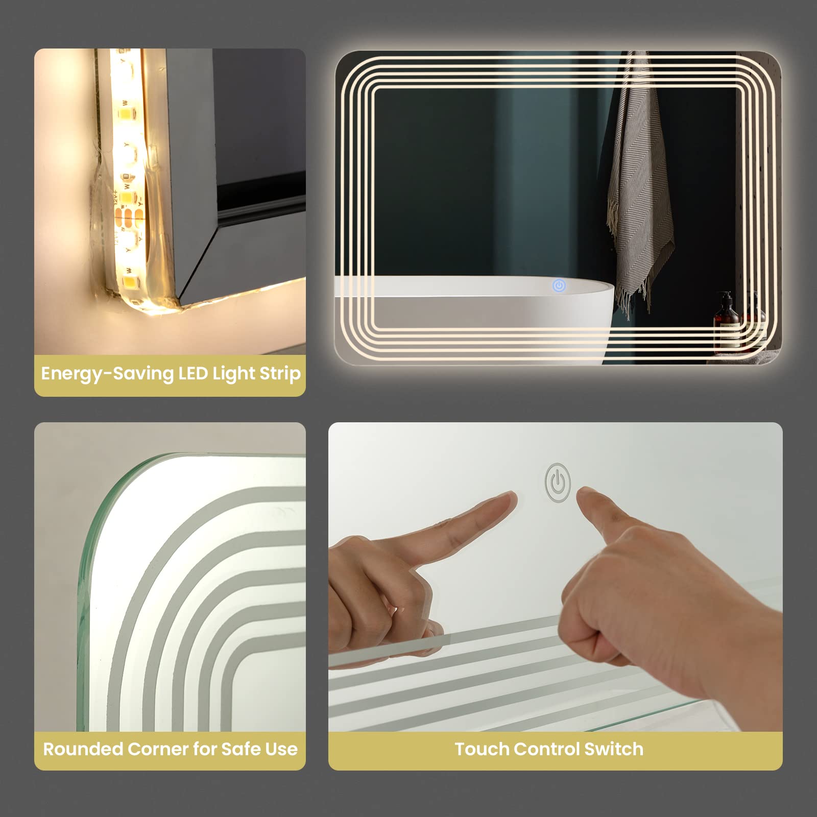 - High-Performance Bathroom Mirror: The LED light has more than 8000 hours of lifespan and is visually comfortable with no flicker. IP64 waterproof protection rating ensures safe lighting in bathroom environments. Besides, this mirror is equipped with a long power line.