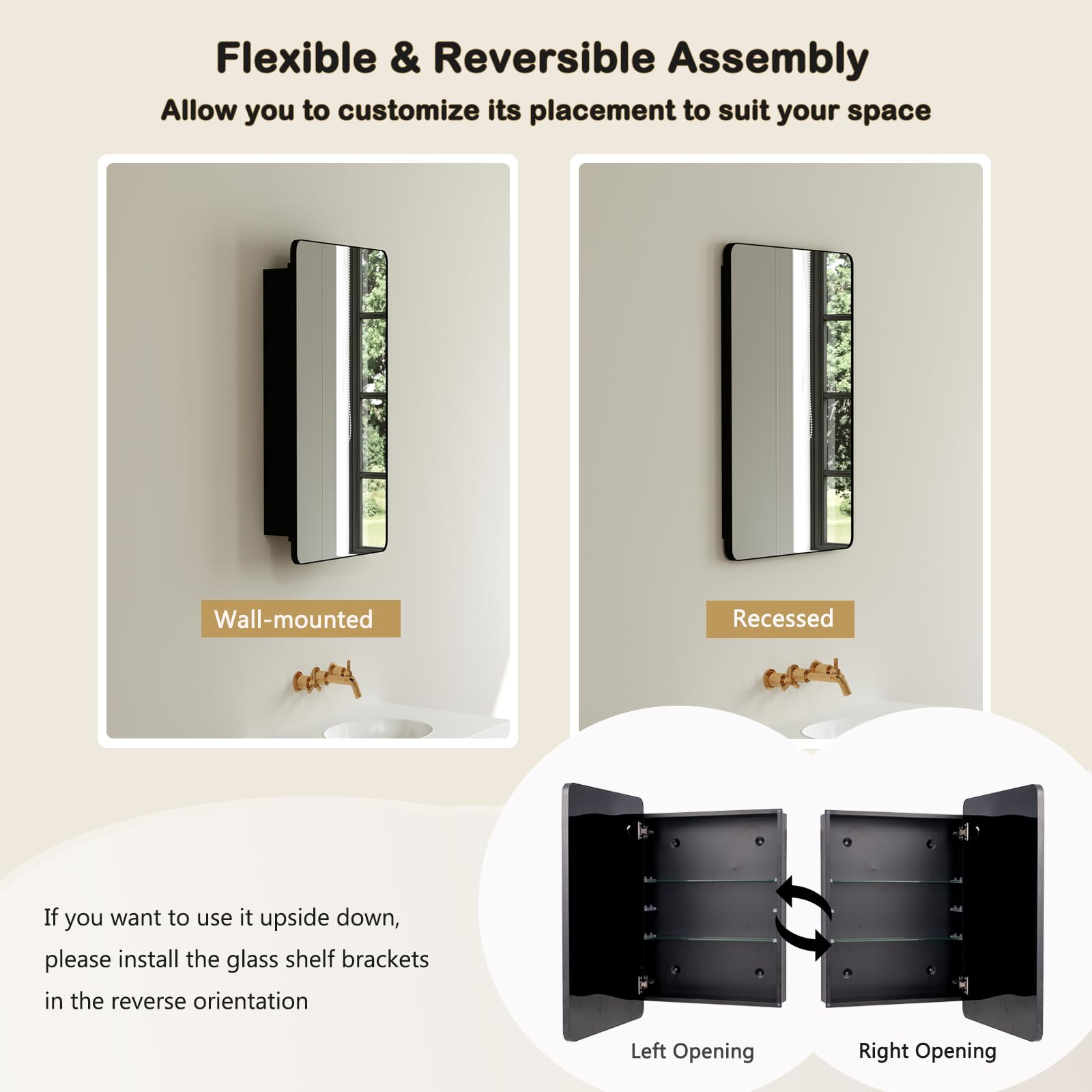 • Versatile installation: The versatile mirrored cabinet features reversible cabinet doors. You can install the doors on the left or right side, depending on your preference, ensuring a perfect fit for any size bathroom layout. Soft-close hinges allow the doors to open and close gently and quietly, adding a touch of sophistication to your daily life