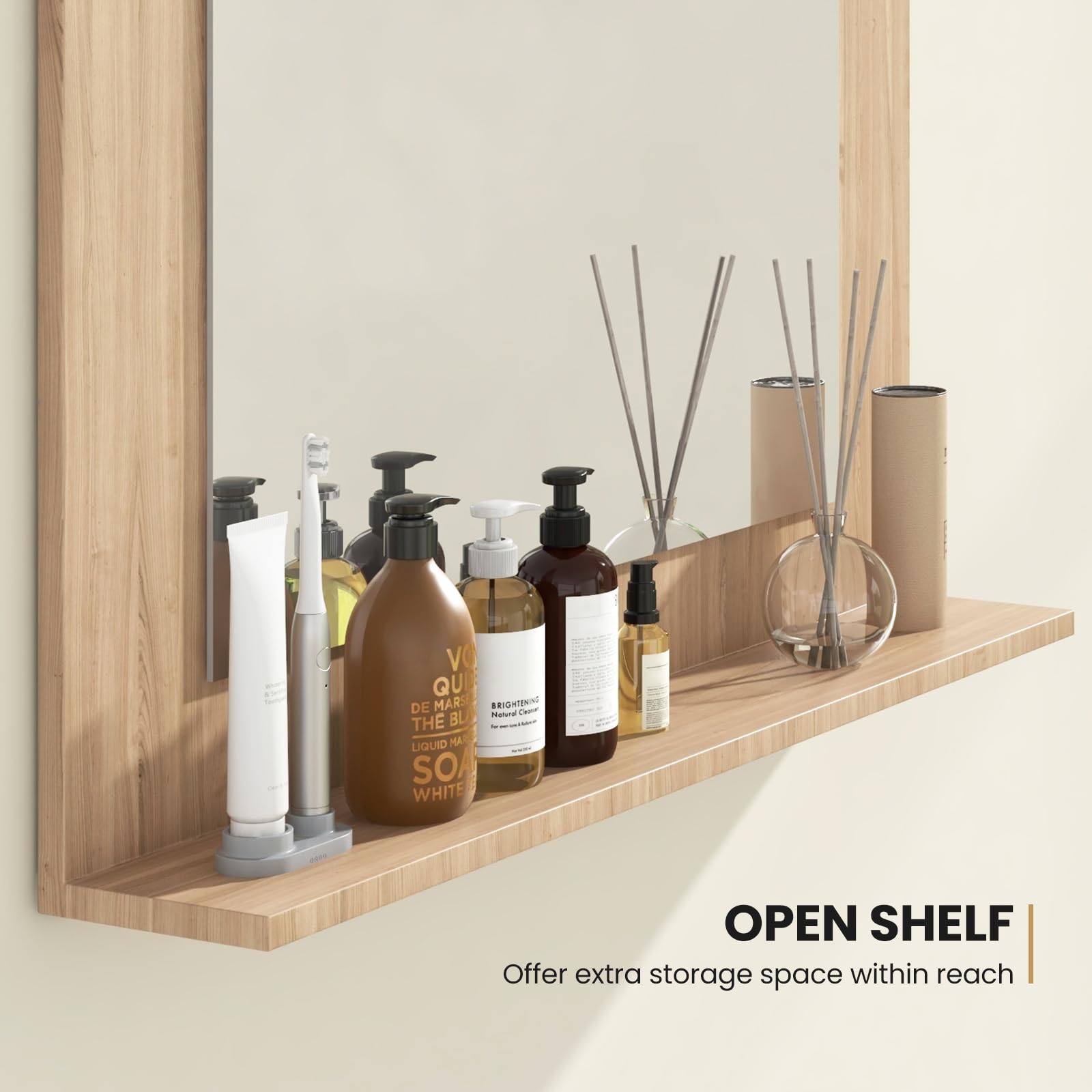 Featuring a practical open shelf for displaying decorative items or storing bathroom essentials, this wall mounting mirror offers extra storage space within reach for your daily routine convenience. The copper-free silver mirror provides crystal-clear reflection with no distortion, perfect for grooming, makeup, and outfit checks. Constructed with a high-quality engineered wood frame, this rectangle mirror exudes elegance, durability, and timeless aesthetic appeal to elevate your space.