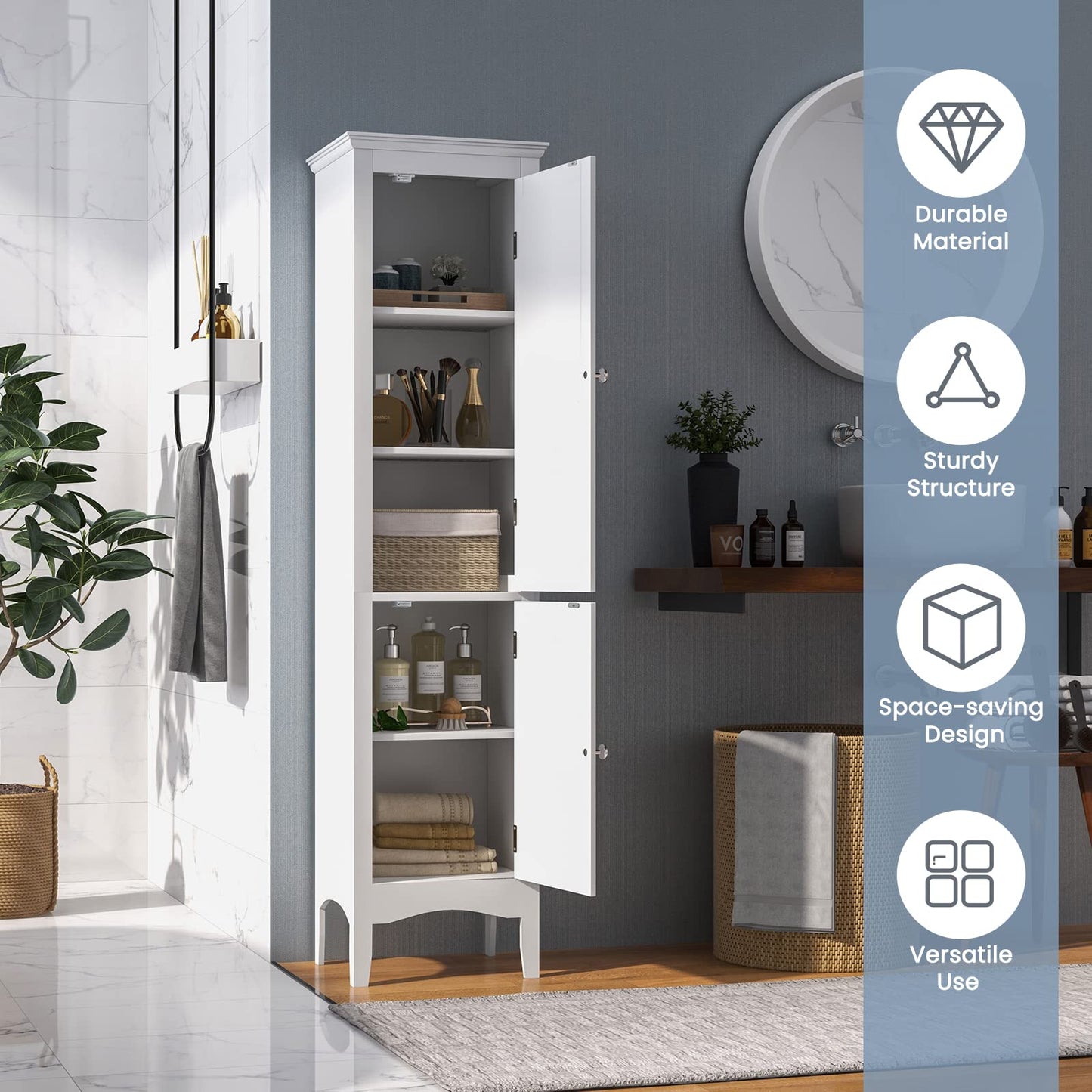 - [Durable Material]: Crafted with premium MDF boards, this tall bathroom storage cabinet is durable and sturdy for many years of use. What's more, the magnetic catch and flexible metal hinge allow you to open the doors easily. The white-painted surface of the cabinet is smooth and easy to clean with a cloth.