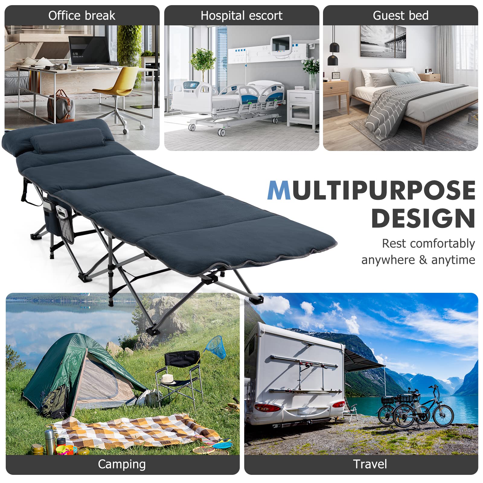 - Wide Range of Applications: The camping cot with a mattress is suitable for camping, beach, hiking, hunting, climbing, travel, and more. It can also be used as a temporary guest bed at home, an escort bed in the hospital, or a nap bed in the office, which can be a perfect choice for indoor and outdoor rest. And there exists a side storage pocket keeping items at hand.