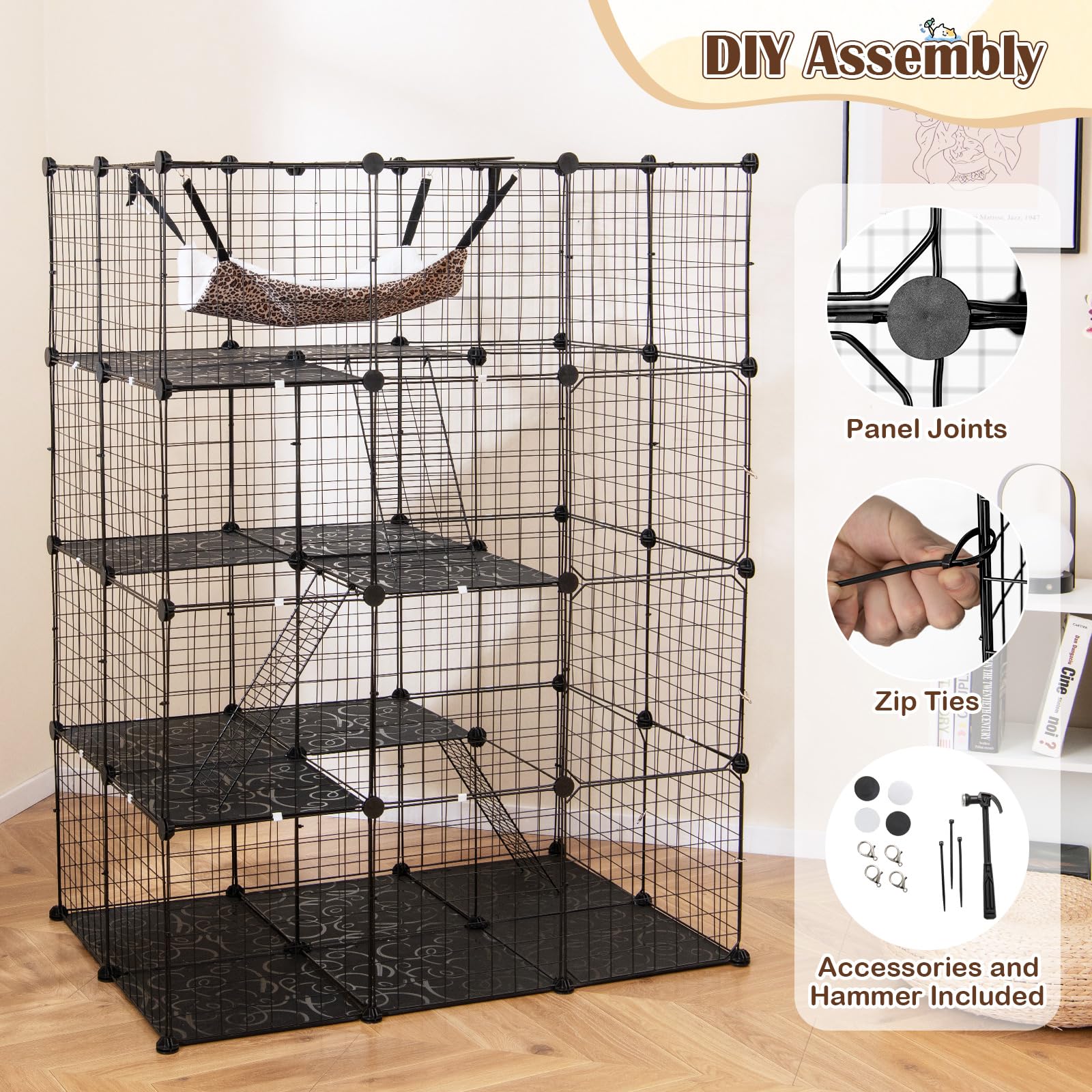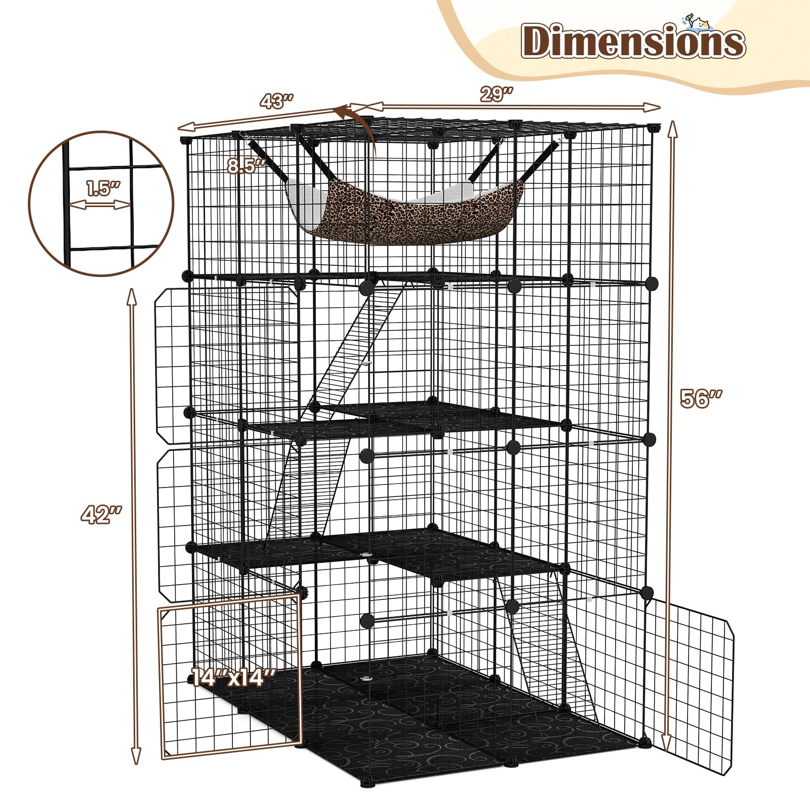 Give your pets the ultimate home with this spacious 4-tier cat cage! Designed for 1-4 cats, it features a soft hammock, 3 climbing ladders, and multiple platforms for endless climbing and relaxation. The lockable skylight and 4 secure doors provide easy access while ensuring safety. Built with reinforced metal wire and PP panels, this sturdy cat enclosure includes an anti-tip kit for extra stability. Its modular DIY design allows for flexible assembly to fit any space. Perfect for cats, rabbits, ferrets, and chinchillas, this well-ventilated metal wire pet playpen creates a comfortable indoor haven for your pets. Upgrade their space today!