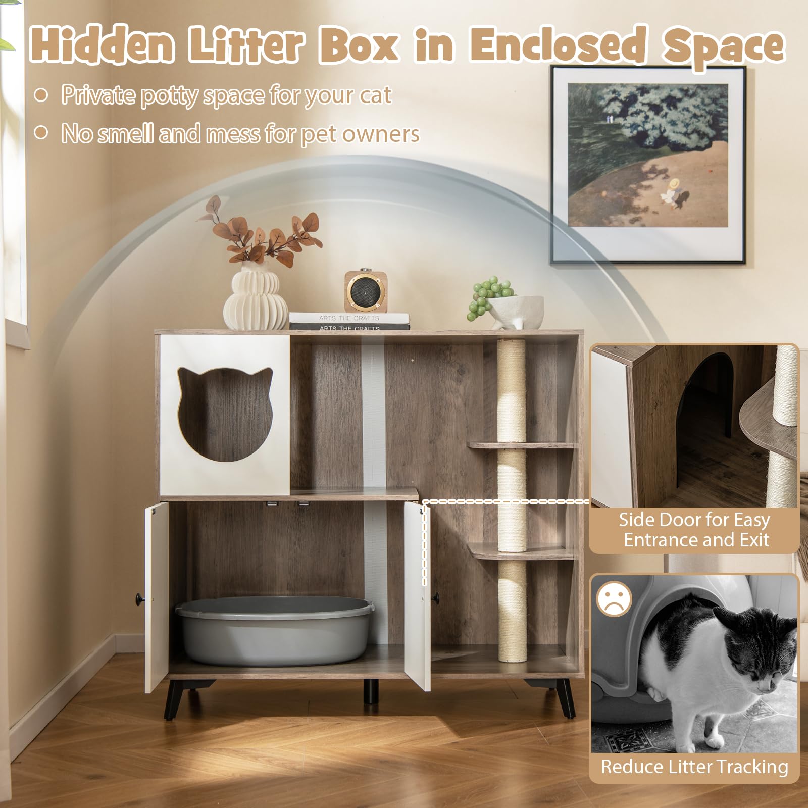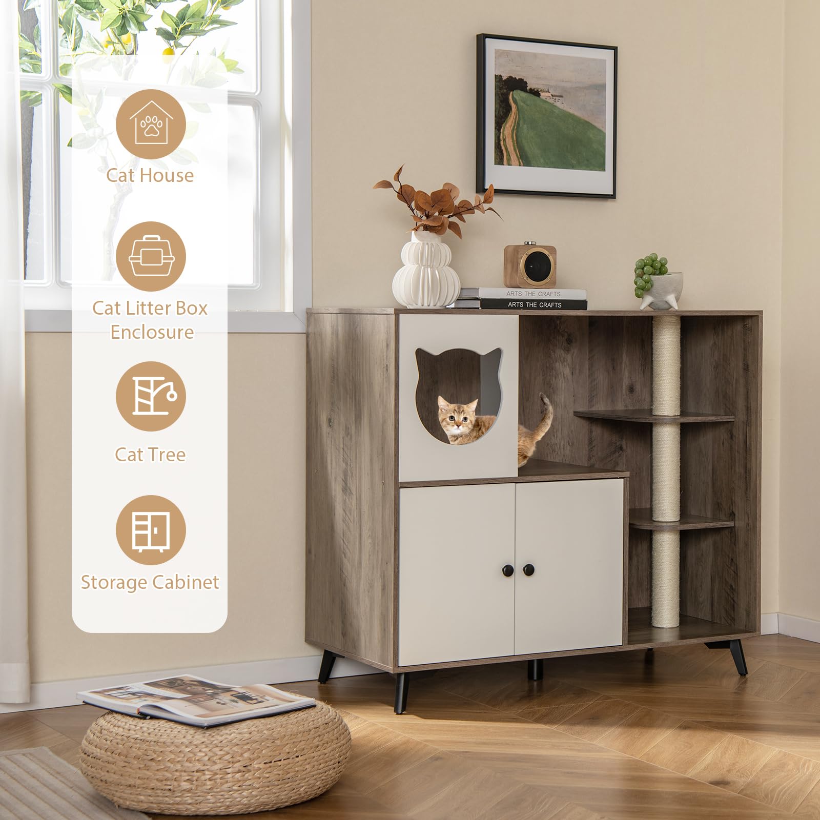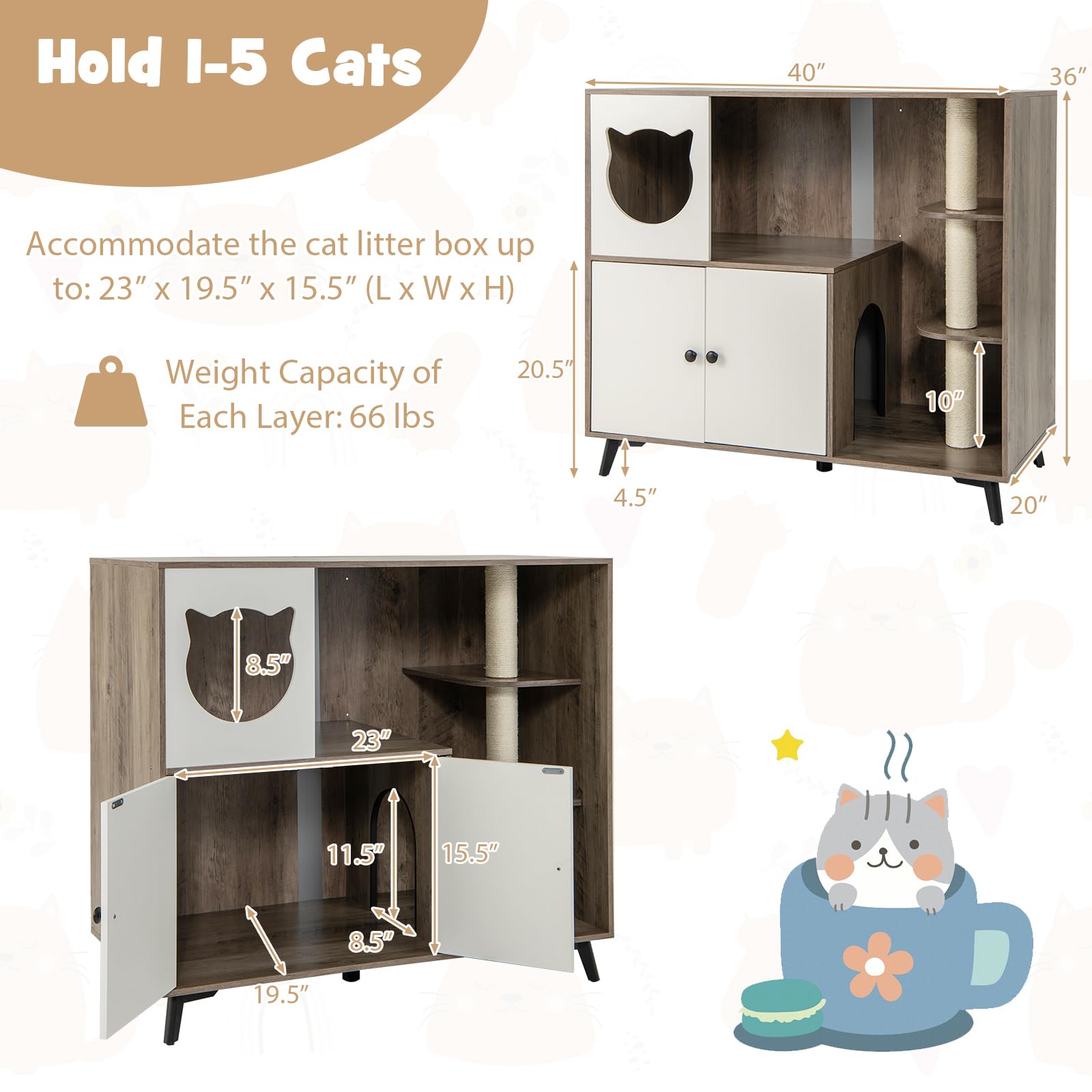 - 5-in-1 Cat Cabinet Furniture: The cat cabinet furniture boasts a cat condo for resting, 3 scratching posts to sharpen their claws and a cat litter box enclosure for privacy. It doubles as an attractive furniture and provides a cozy spot for your cats to play.