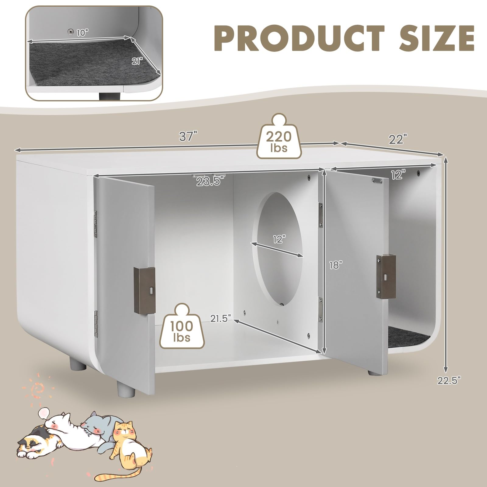 Choose our cat litter box enclosure to reduce clutter and offer privacy for your cats! The enclosed litter box furniture comes with a double door cabinet to conceal cat litter box and let your cats poop privately. Meanwhile, the large cabinet and wide tabletop offer sufficient space to store kinds of items, making it a good choice as a spacious side table. Moreover, there is a inner access hole to allow your furry friends take to litter to the side compartments. There exists a removable mats for cleaning. Thus, with our large cat litter box enclosure, you will have no more worries about messy room. Supported by rubber wood legs, the cat house furniture can hold up to 150 lbs weight. And there are adjustable pads to add its stability. Thanks to chic and simple design, the cat litter box enclosure is not only a cozy cat house for your furry friends, but also a functional furniture to keep your room clean and organized.
