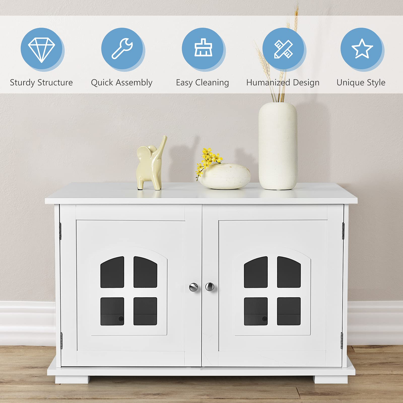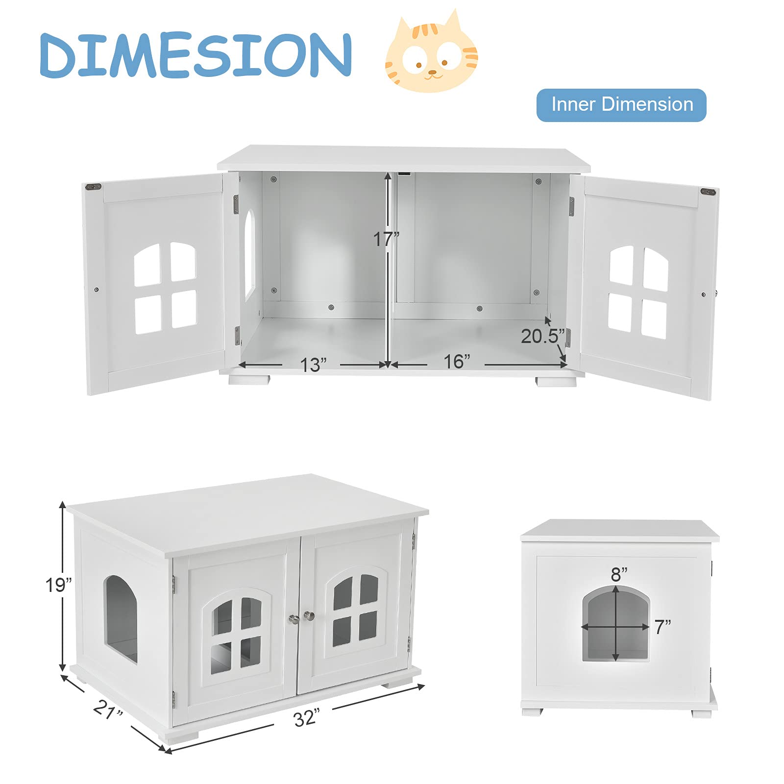 Are you still looking for a cozy cat litter box for your lovely pet? Do you want to take better care of your cat? If your answer is yes, all you need is this large-sized pet house. With the side access door and 2 windows on the door, the litter box is well-ventilated to avoid smelling. Features an interior panel that prevents litter from being kicked out and tracked onto the floor, the litter box chest is easy to clean and can always keep your home sanitary and odorless. The high-quality MDF structure and water-proof paint make this litter enclosure more durable and stronger. In addition, you can also take this cat house as a cabinet or bedside table owing to its large storage space and handsome appearance.