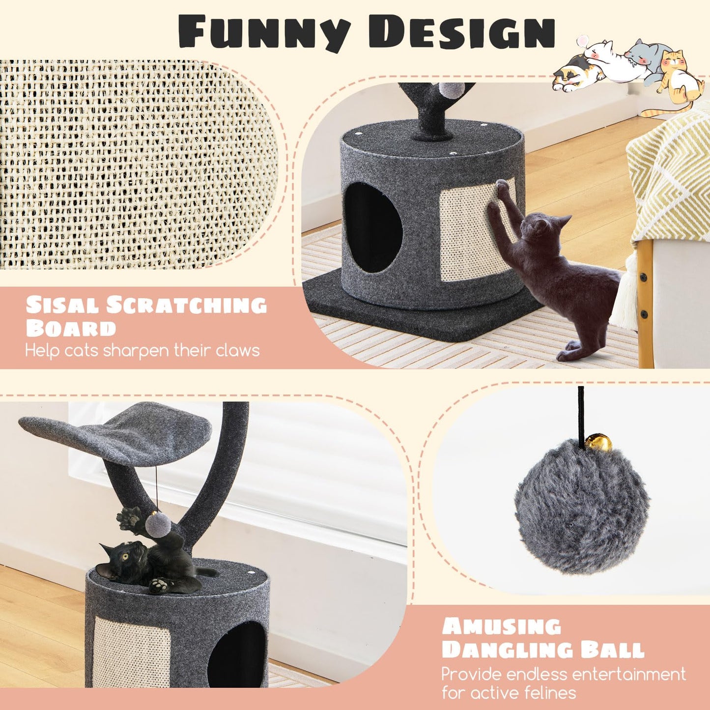 • Funny Design: There exists a sisal scratching board on the condo side, which can help cats sharpen their claws while protecting your furniture from destruction. Moreover, the cat tower is equipped with an amusing dangling ball, providing endless entertainment for active felines.