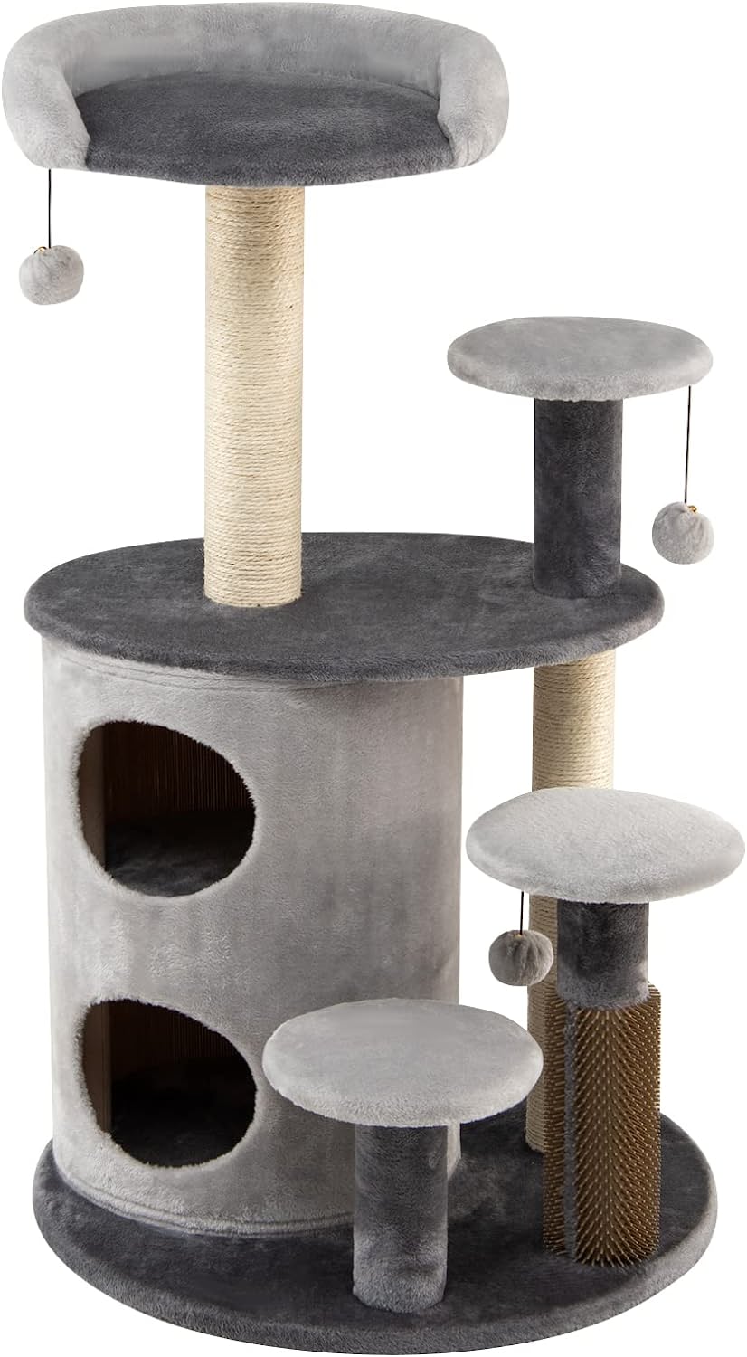Enjoyable play center with 4 perches, 1 condo, 2 amusing furballs, 1 cat self-groomer, and several scratching posts