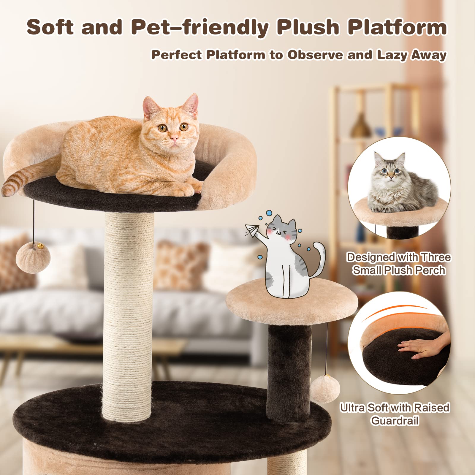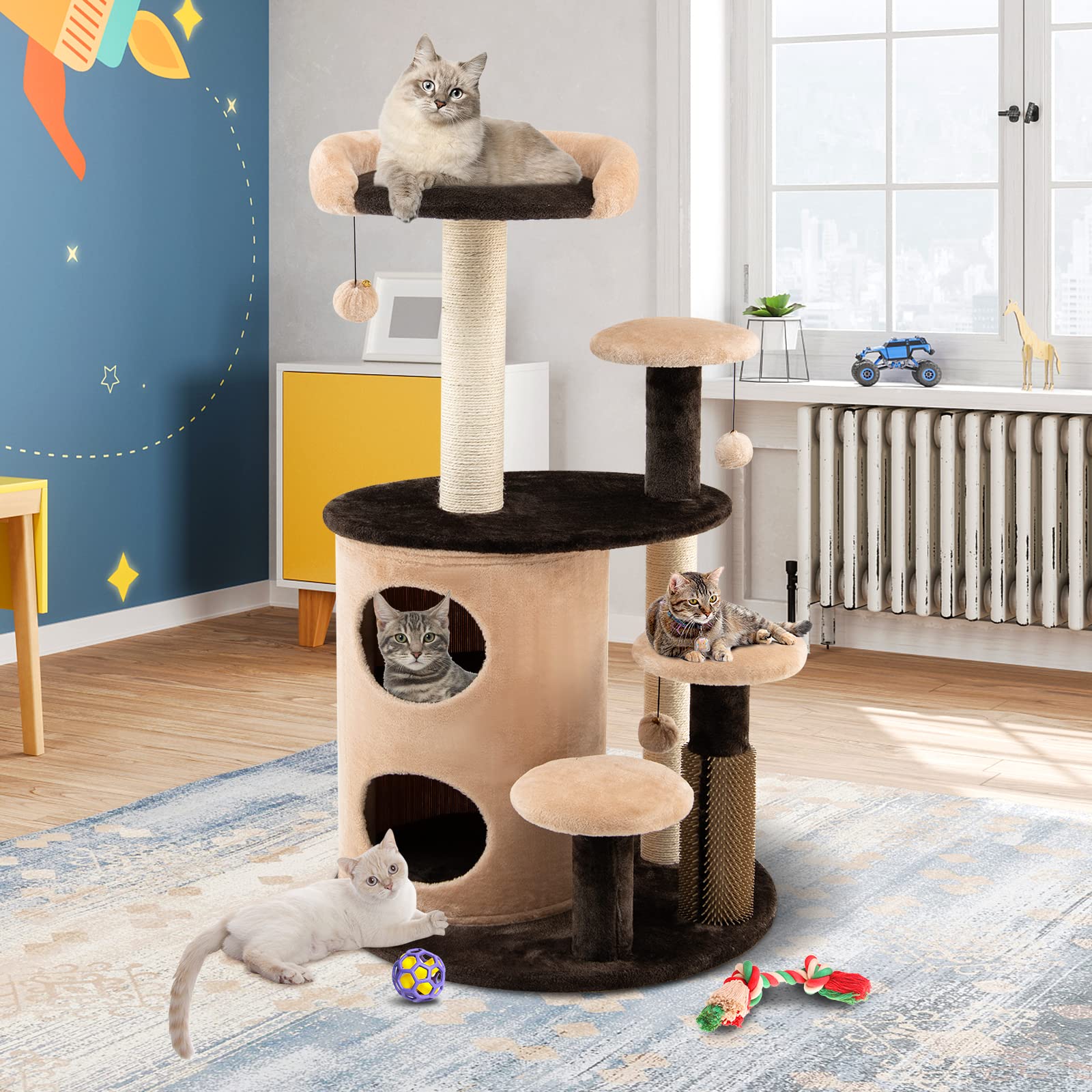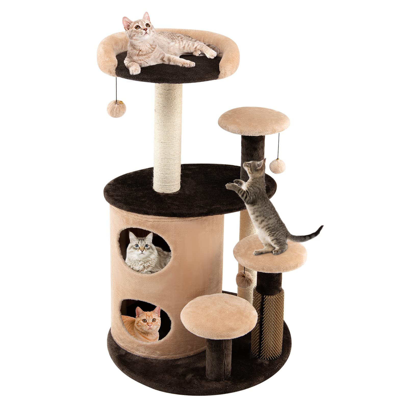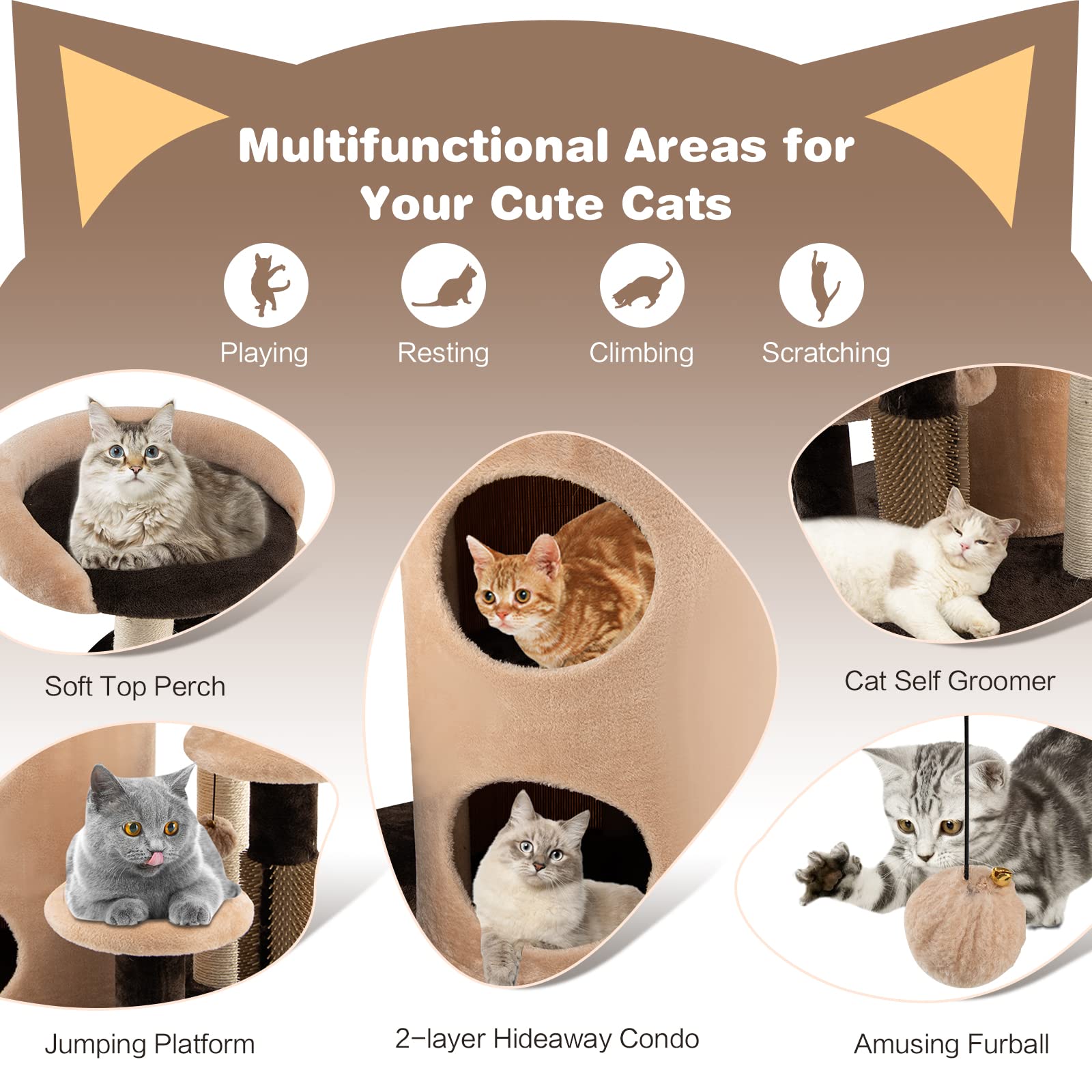 - Spacious 2-layer Hideaway Condo- The cat tree is well-designed into an attractive playground, composed of 3 perches of different sizes, a 2-layer condo, 2 amusing fur balls, a cat self-groomer, and several sisal posts for scratching. The circular perches are evenly staggered which provides easy access to get each level for the kitty to play, curl up, relax and snooze.