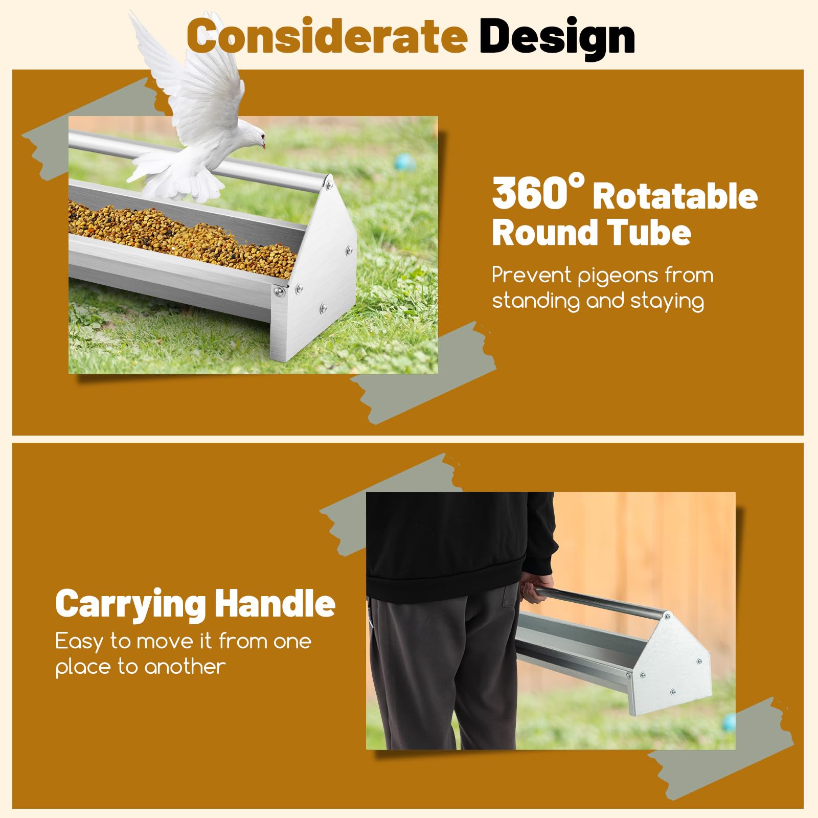 - Rotatable Crossbar Design: The chicken feeder is equipped with a 360° rotatable round tube to prevent pigeons from standing and staying. Meanwhile, it also serves as a carrying handle, allowing you to move the chicken feeder to another place with ease.