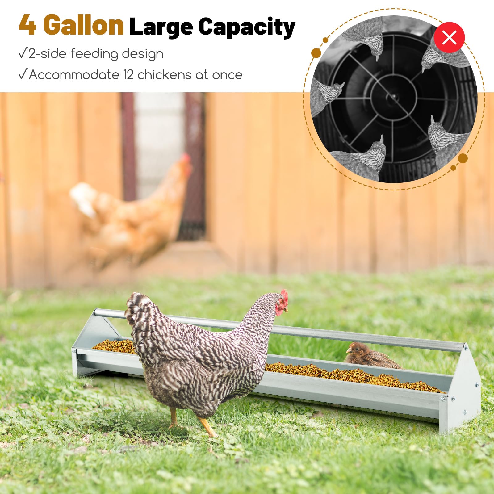 - Generous Capacity: Featuring a 4 gallon large capacity, this chicken feeding trough is able to hold ample feed, reducing refill frequency without plenty of waste and mess. Besides, with the 2-side feeding design, it can accommodate 12 chickens at once.