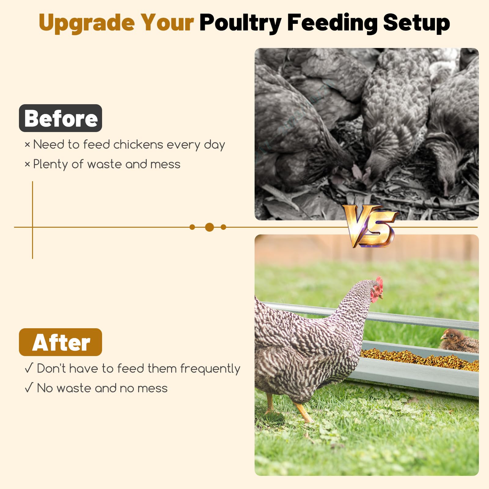 - Built to Last: Crafted from sturdy and rustproof galvanized steel, this poultry feeder is deformation-resistant and durable for any outdoor settings. What's more, the waterproof surface makes it easy to clean.
