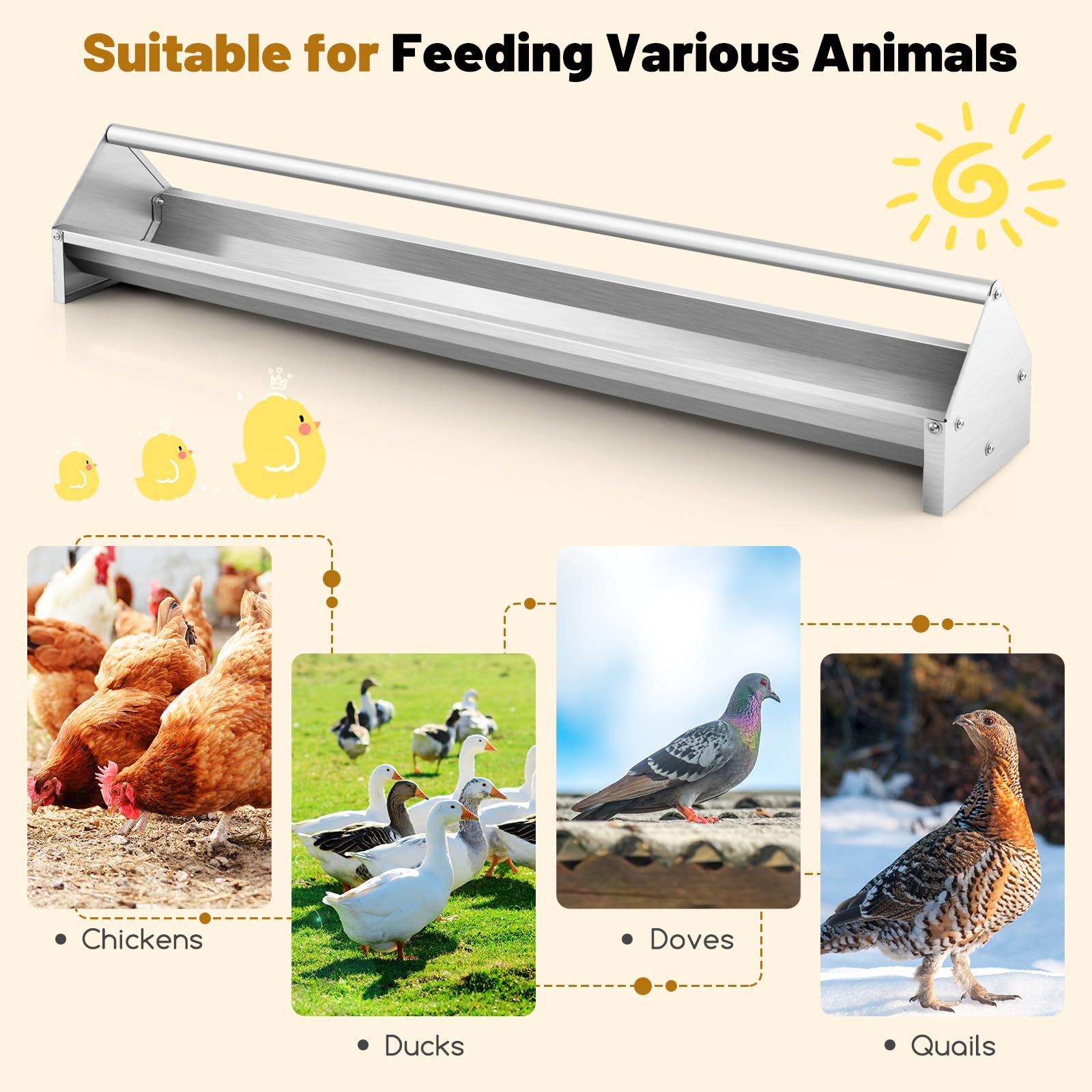 - Versatile Use: This 45" long galvanized steel poultry feeder is suitable for feeding various animals, such as chickens, ducks, doves, quails and so on. It will be a perfect addition to your coop, cage, farm and more.