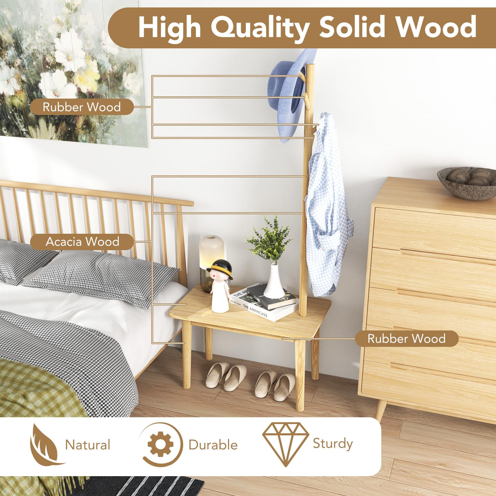Tangkula Coat Rack with End Table, Solid Wood Coat Tree with 2-in-1 Side Table & 3 Hooks for Hats, Bags & Coats