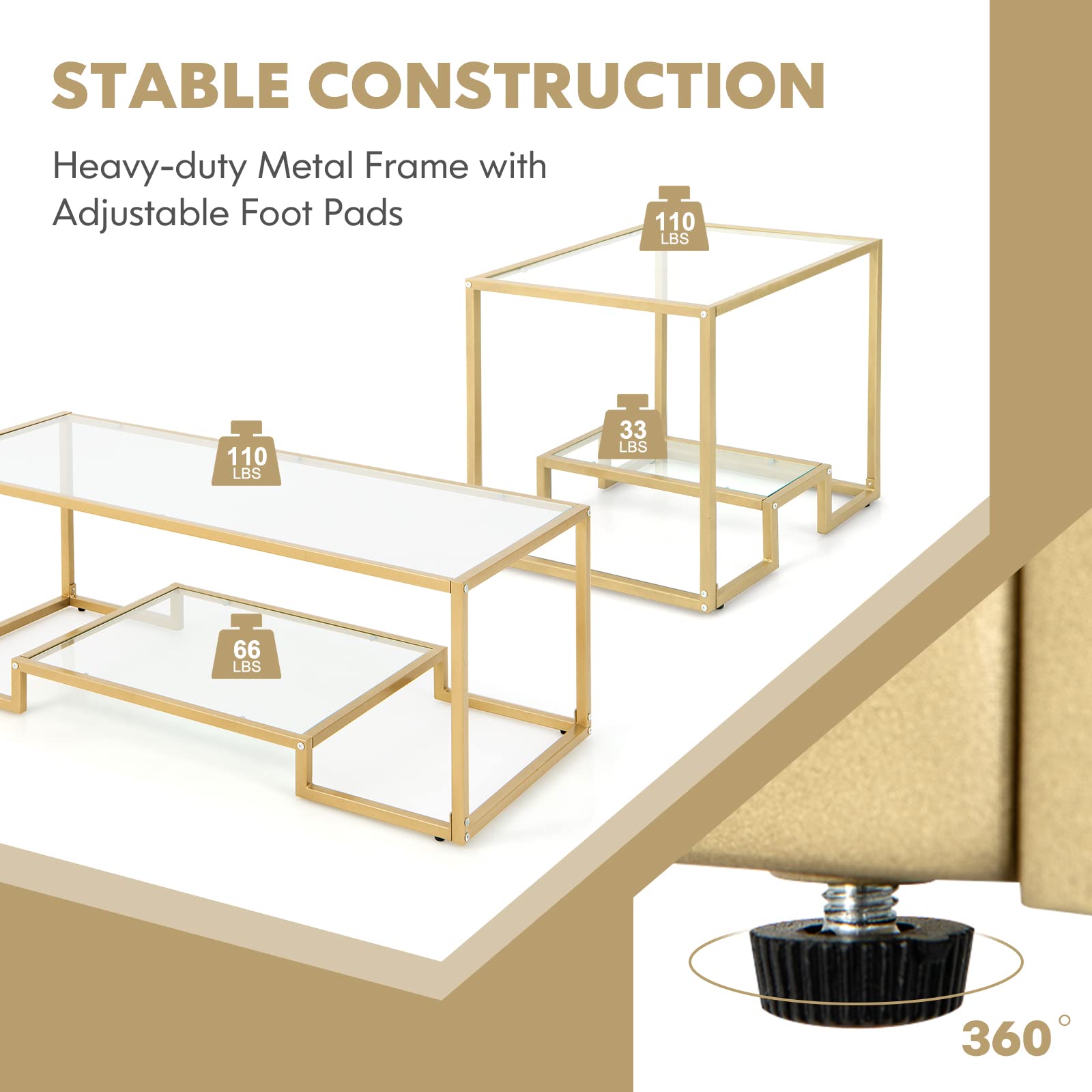 If you fancy a modern and luxurious living room, don't miss this living room accent table set! The chic golden frame is exactly what you need to refresh the space with a sophisticated deluxe flair. ?And for years, it will still be stylish and sturdy, as the heavy-duty metal material with powder coating can remain in good condition and endure the test of time. What's more, the tempered glass is also durable and sturdy, offering the perfect platform for displaying stylish trinkets. It will meet your need of having afternoon tea, display ornaments, or storing sundries with a wide and flat tabletop. Besides, you can freely arrange the tables to maximize the utilization of space.