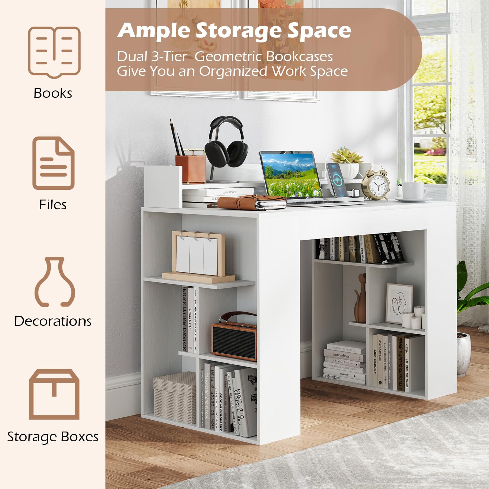 Ample storage space for books, files, decorations, and storage boxes