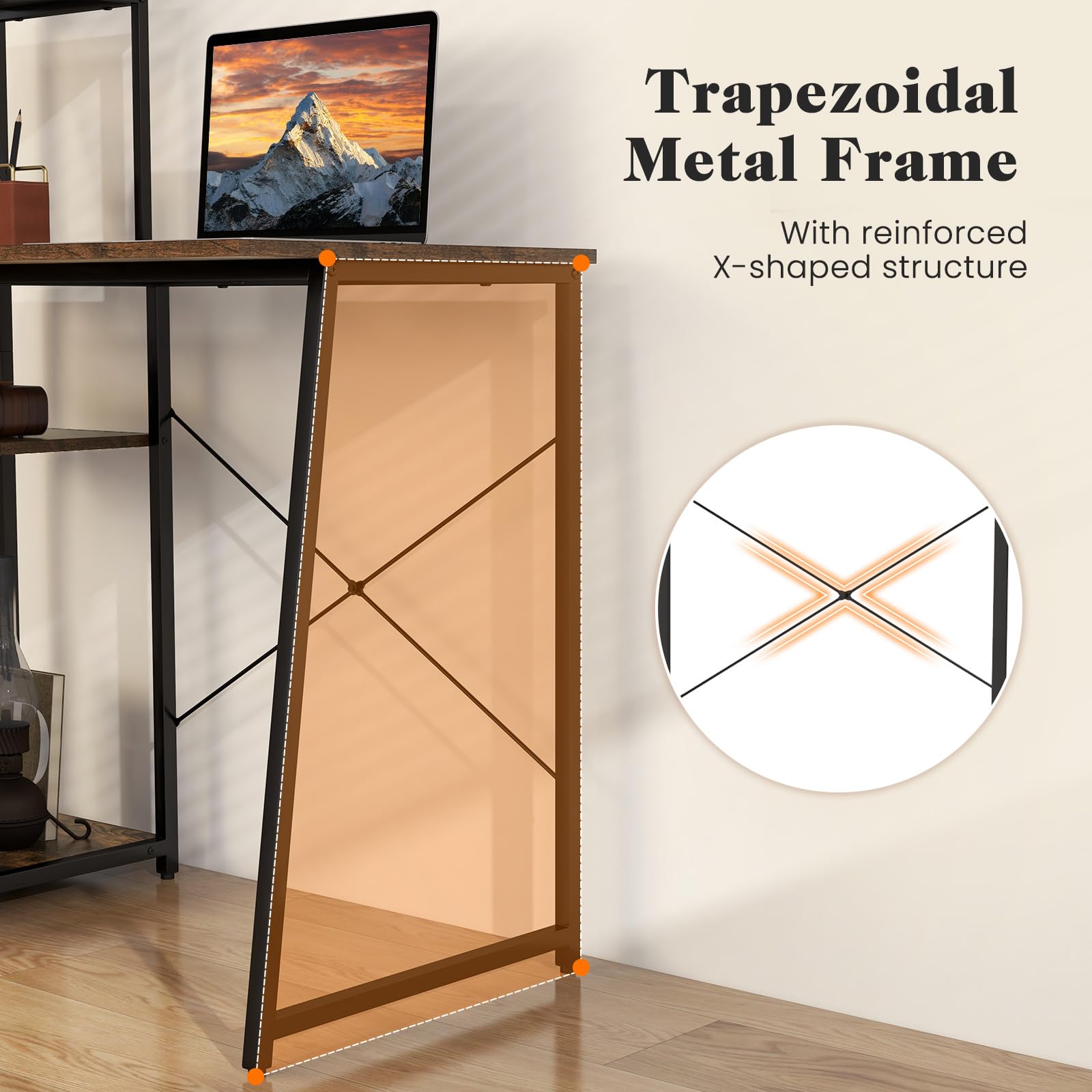 Upgrade your home office with this sleek, space-saving desk that not only saves space but boosts productivity. Featuring a versatile design, this office desk comes with a built-in bookshelf and generous 3-tier storage, perfect for books, files, and a hidden CPU stand. Its solid metal frame is elegantly designed with ladder-style and cross-shaped reinforcements offering both style and durability. Perfect for small spaces, this computer desk fits seamlessly into any corner. Plus, it includes adjustable foot pads for uneven floors. Don’t miss out on organizing in style. Make it yours today!