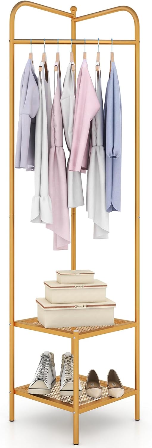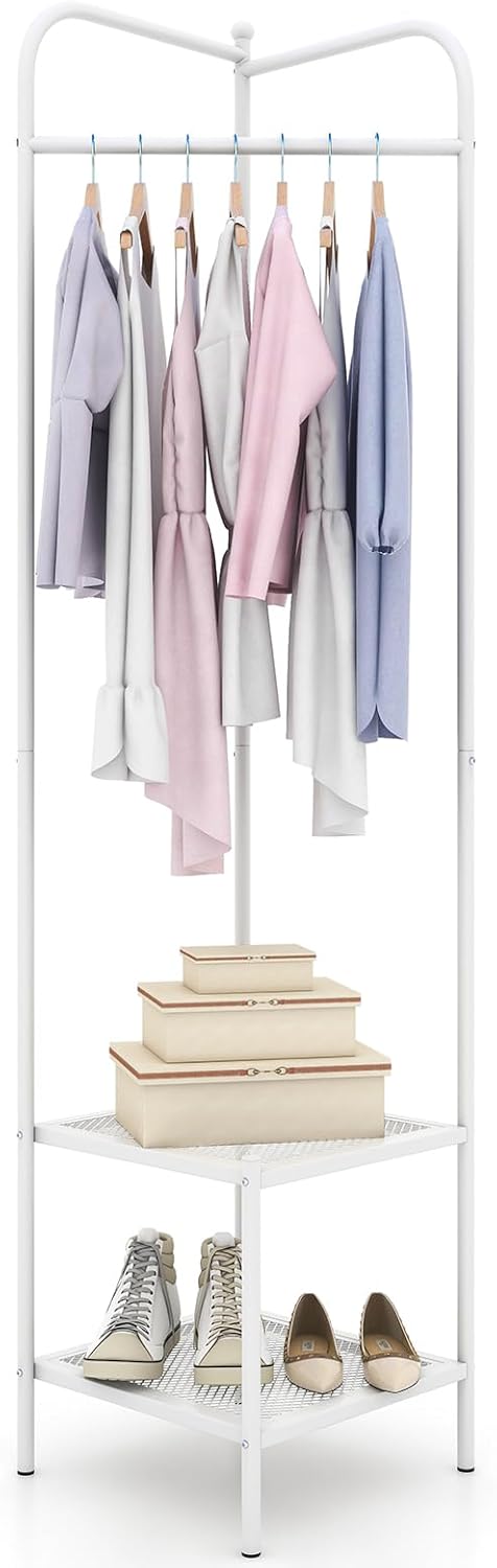 Crafted to fit snugly in any corner, this coat hanger stand maximizes space while providing ample room to hang coats, scarves, and umbrellas. Not only that, it has 2 mesh shelves to store your clothes, shoes, storage baskets, and more. In addition, measuring 17” x 17” x 76”(L x W x H), the freestanding coat rack won’t take up too much floor space, which is ideal for any corner of your home. You can place it in hallways, entryways, living rooms, bedrooms, and more. The solid metal frame with non-slip foot pads make it steady and not easy to wobble. Furthermore, the anti-toppling design brings added safety and sturdiness.The rounded corners and protective cap prevents accidental scratches.
