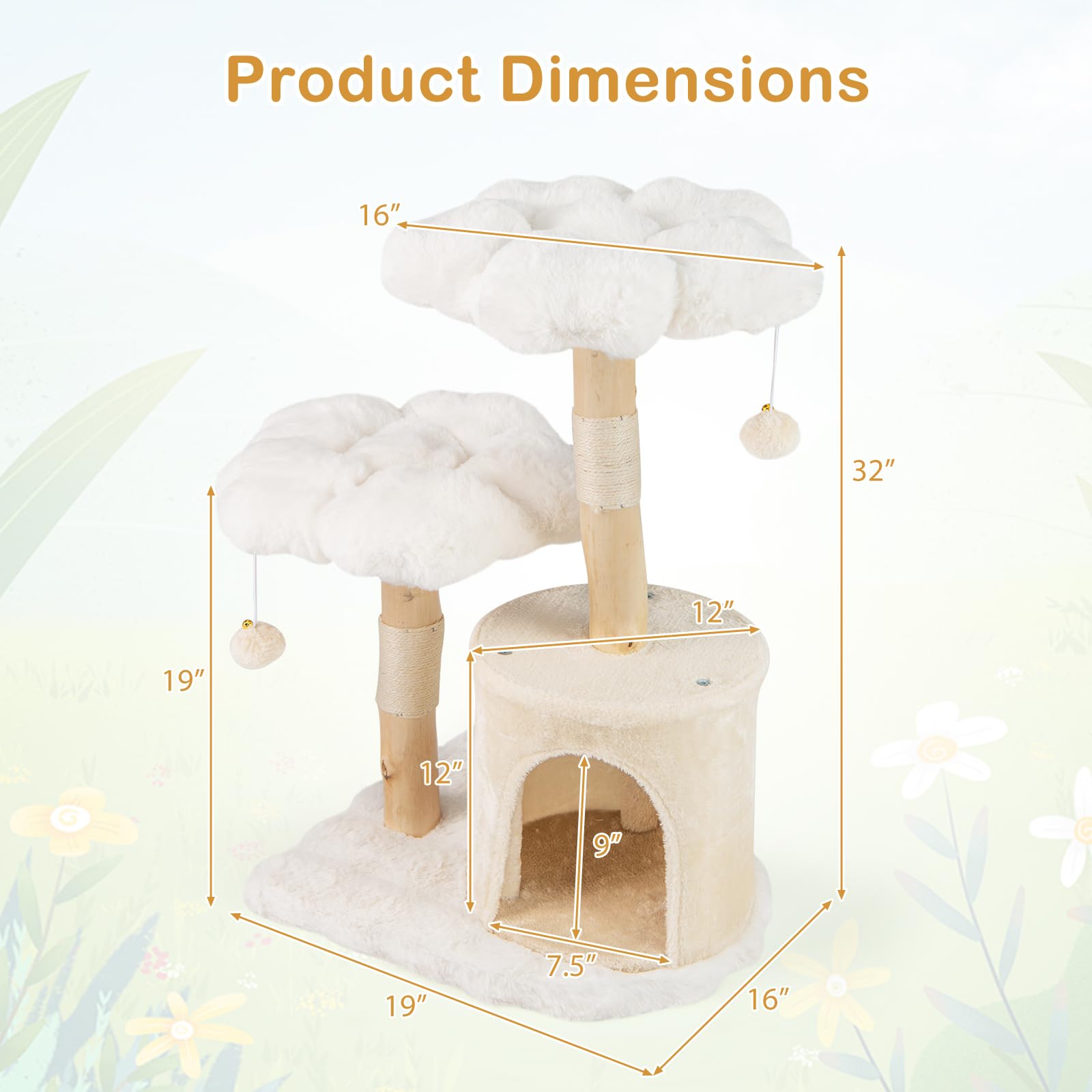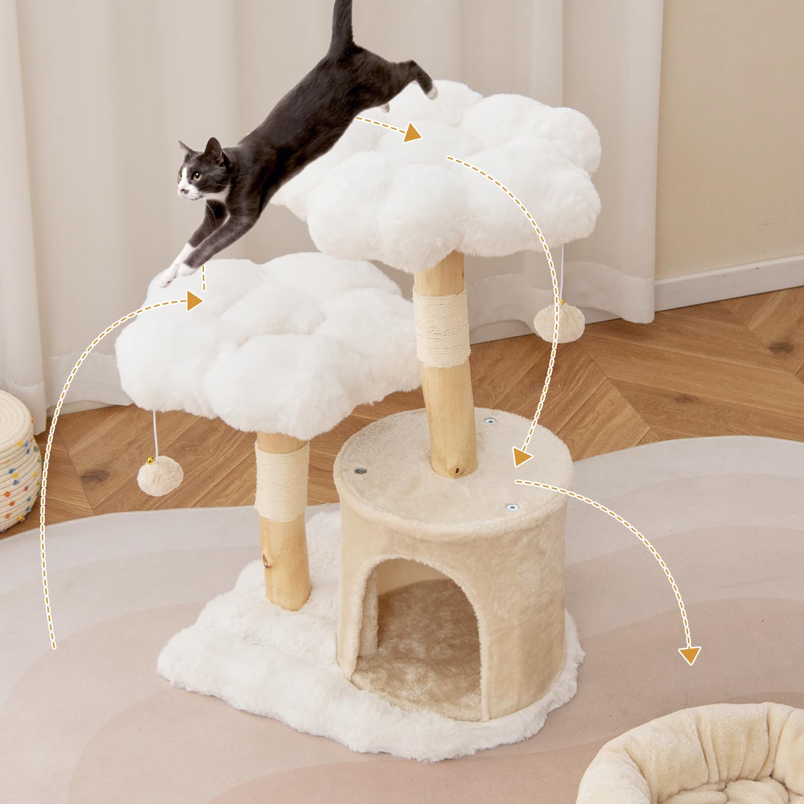 - Multiple Resting Options: The wood cat tower is equipped with 2 flower-shaped thick-padded platforms at varying heights, perfect for felines to lounge and survey the surroundings. Additionally, a cozy cat condo is included for those private and peaceful catnaps.