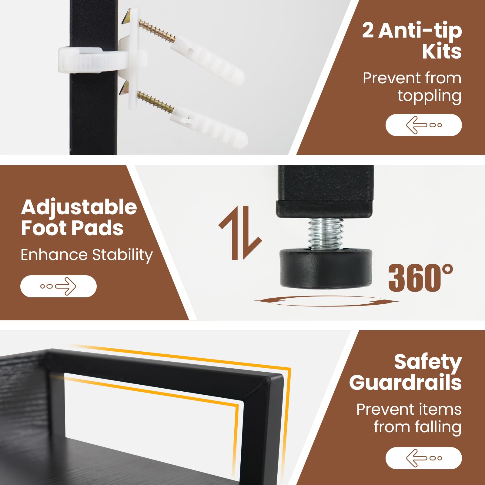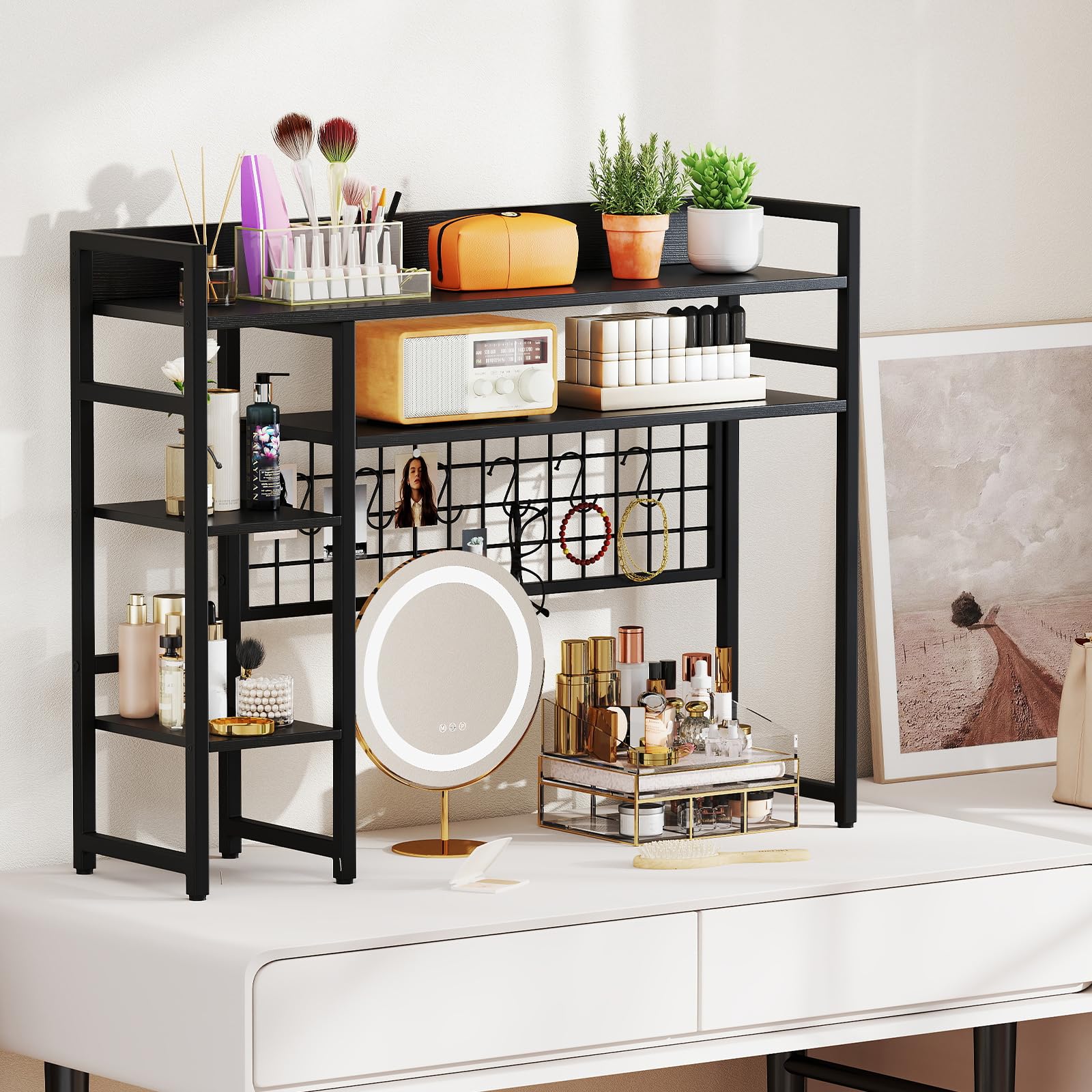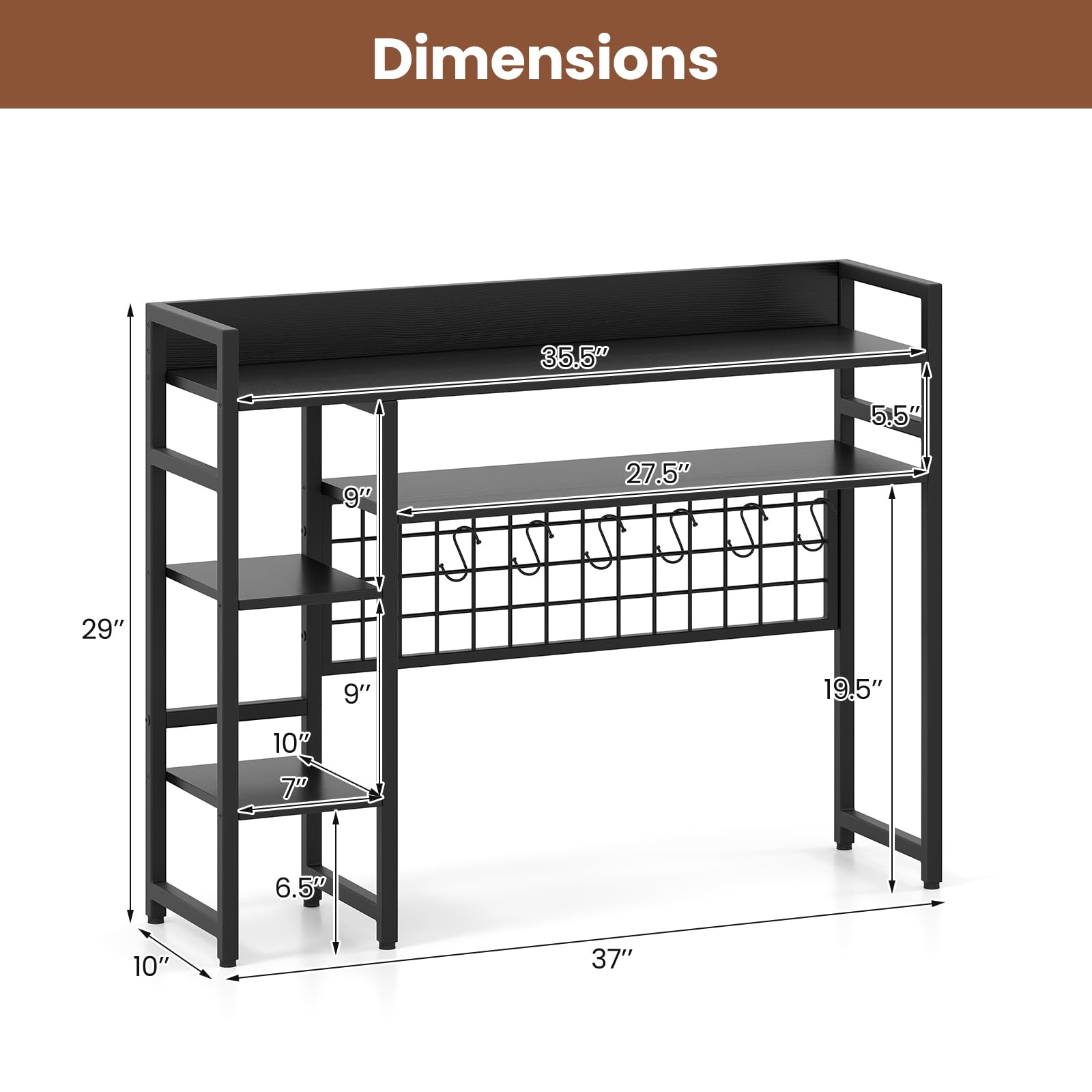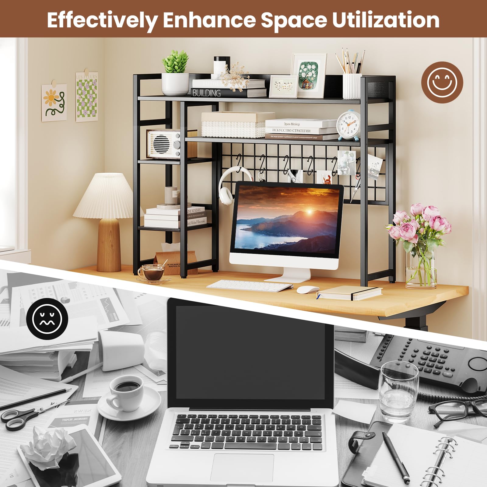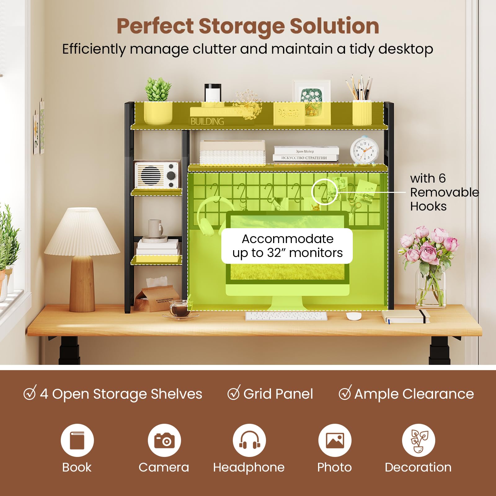 Featuring 4 open shelves and a grid panel with 6 removable hooks, this organizer is perfect for neatly storing books, decorations, or hanging personal items like headphones and keys, blending functionality with a personal touch. The compact design, measuring 37" x 10" x 19" (L x W x H), efficiently uses space while accommodating up to 32" monitors, ideal for those looking to enhance their visual workspace without sacrificing room. Built from thick boards with a heavy-duty metal frame and reinforced crossbars, it promises stability and durability. Sporting a classic vintage style, this hutch suits various settings, from studies to bedrooms and kitchens, adding a touch of elegance and practicality wherever placed. Elevate your home or office environment with our stylish and sturdy desk hutch today.