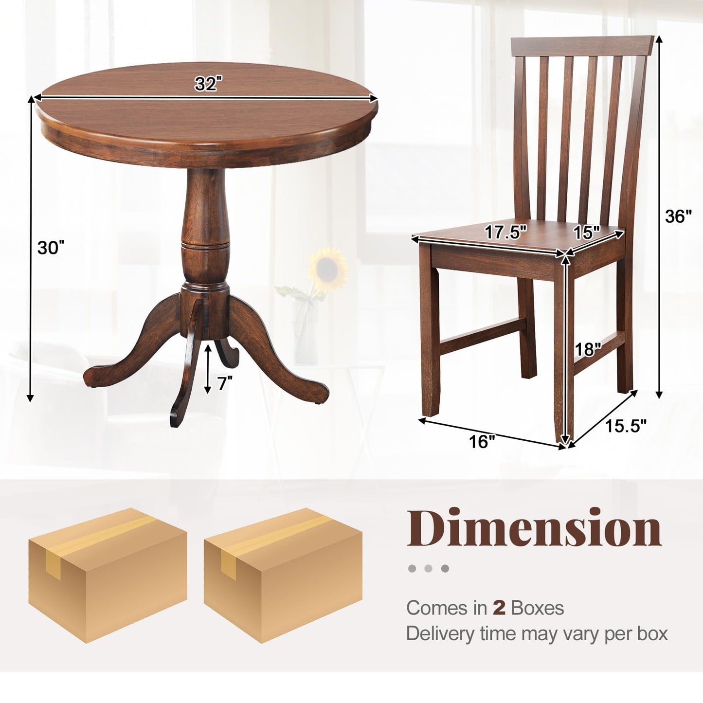 - Ideal Size for Your Dining Area: Featuring 1 dining table and 2 chairs, this dining room furniture set is perfectly proportioned. The round kitchen table has dimensions of 32" x 30" (Dia x H), while each chair measures 17" x 15.5" x 36" (L x W x H).