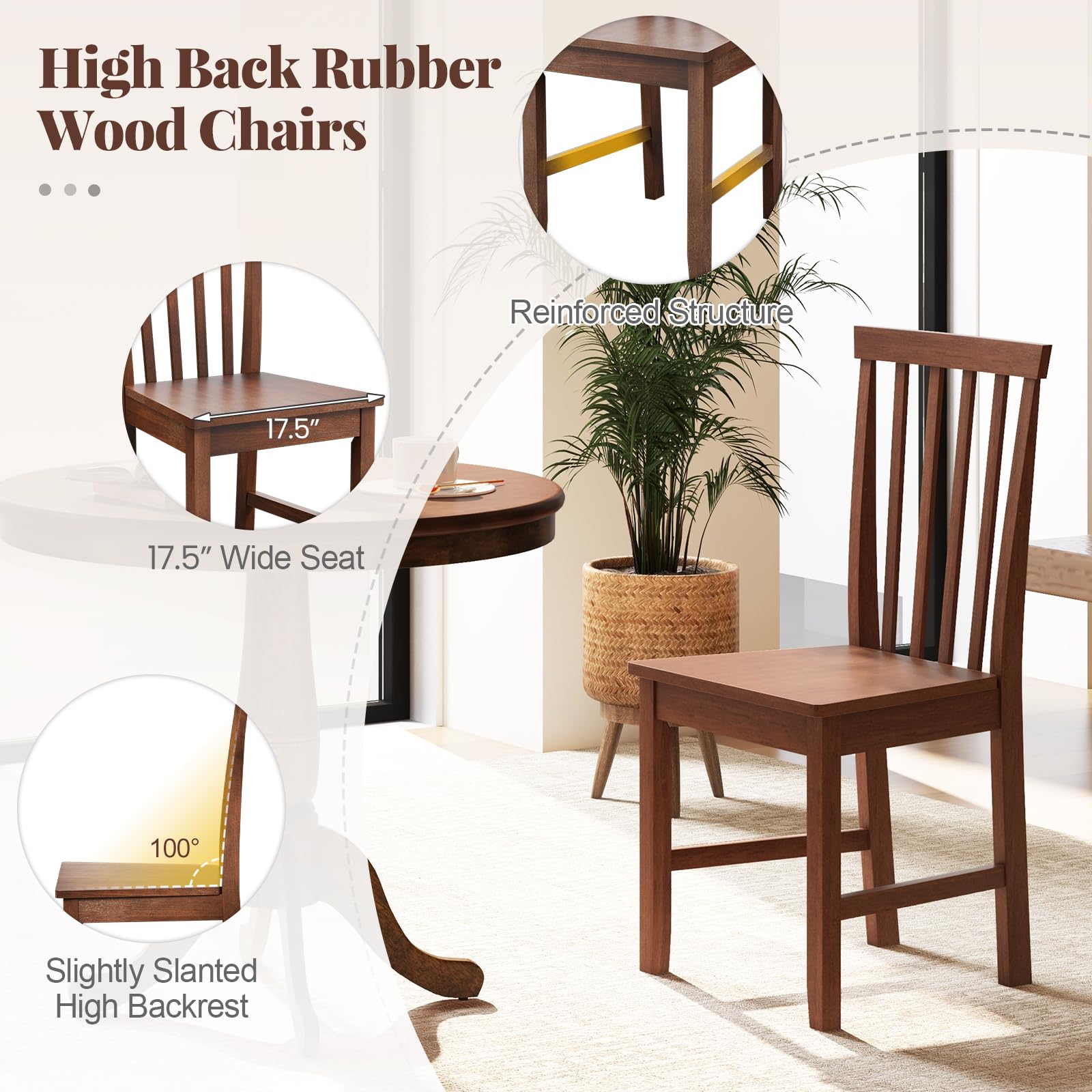 - Comfortable and Ergonomic Design: The chairs are designed with a high backrest and wide seat for a cozy seating experience, while the slight slant enhances ergonomic support. With a comfortable seat depth and height of 15” and 18”, respectively, this set provides a relaxing dining setting.