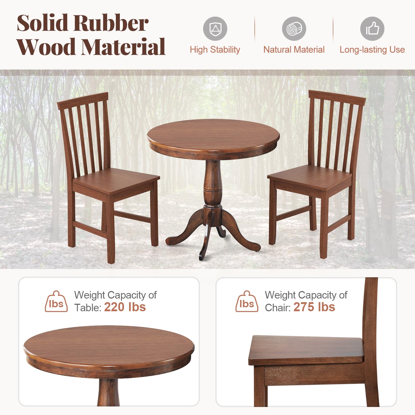 - Solid Build with High Weight Capacity: Crafted from solid rubber wood material, this dining set ensures exceptional stability and longevity. Each chair can support up to 275 lbs, catering to a wide range of users. Additionally, the adjustable foot pads offer stability on uneven surfaces.