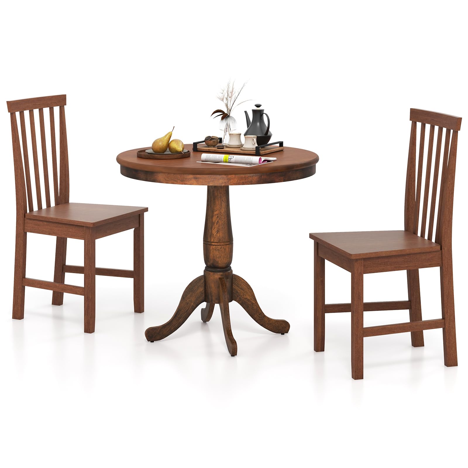 This 3-piece dining set includes 1 table and 2 chairs, ideal for accommodating 2 people and versatile for use as a coffee table as well. Crafted from high-quality MDF and natural rubber wood, both the table and chairs are sturdy and built to last. The rounded tabletop with smooth edges ensures safety and prevents scratches. The chairs feature slanted backrests and spacious seats for comfort and ergonomic support, while the walnut color and wood grain surface add a touch of retro charm to the set.